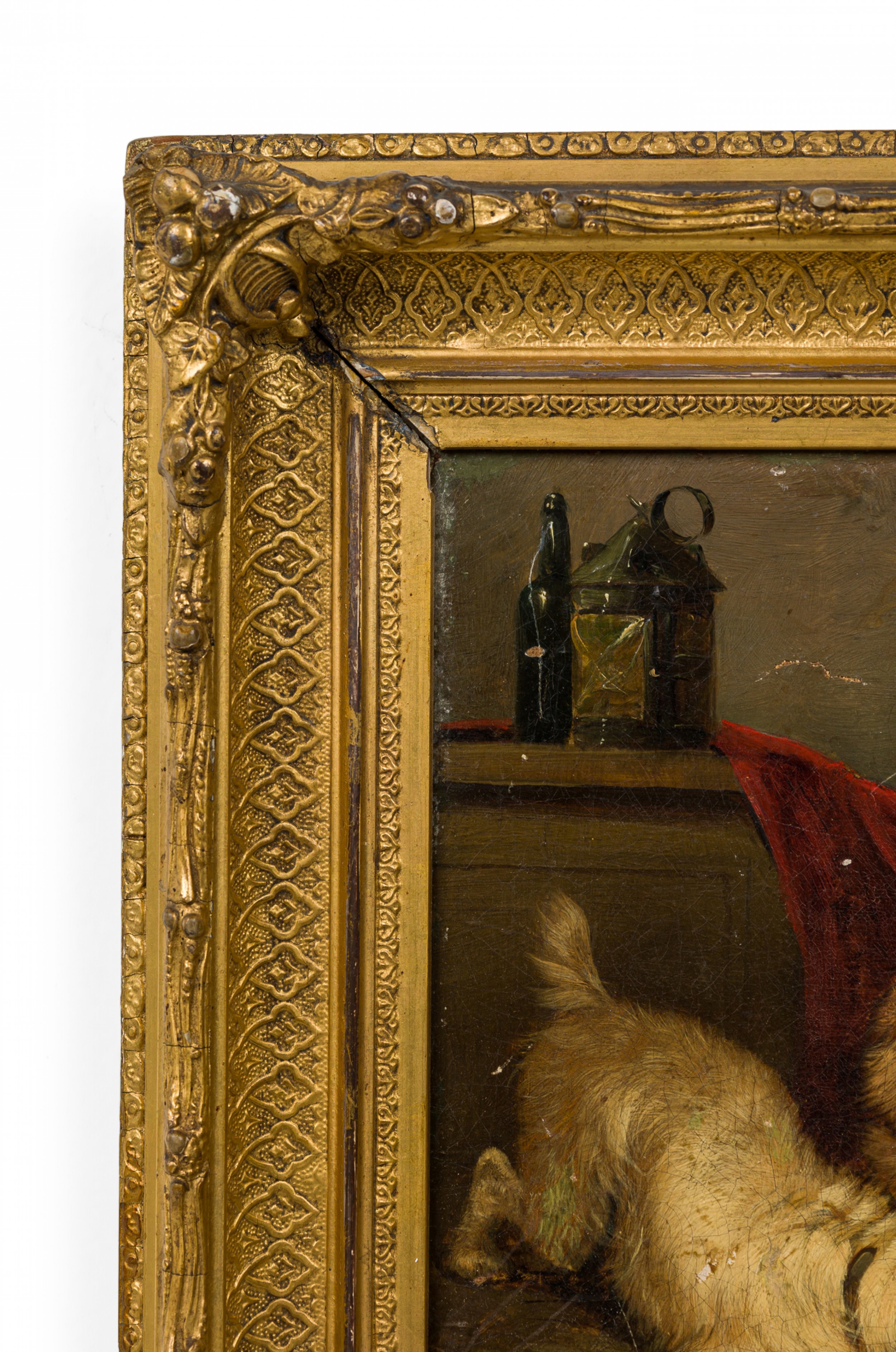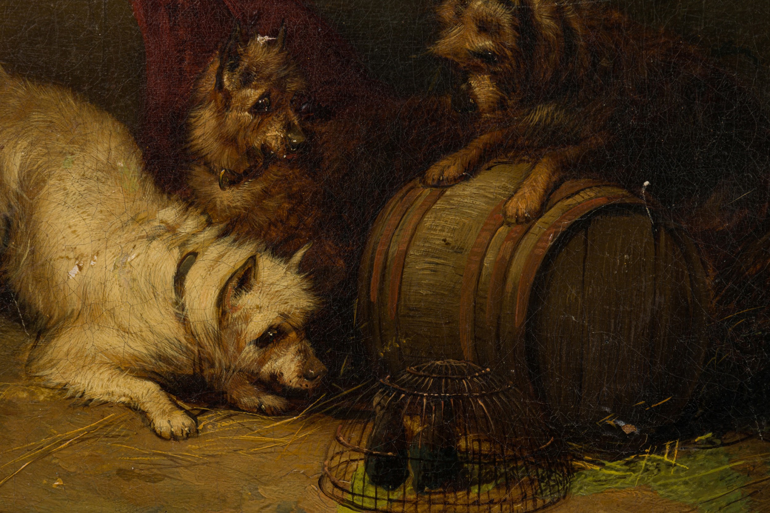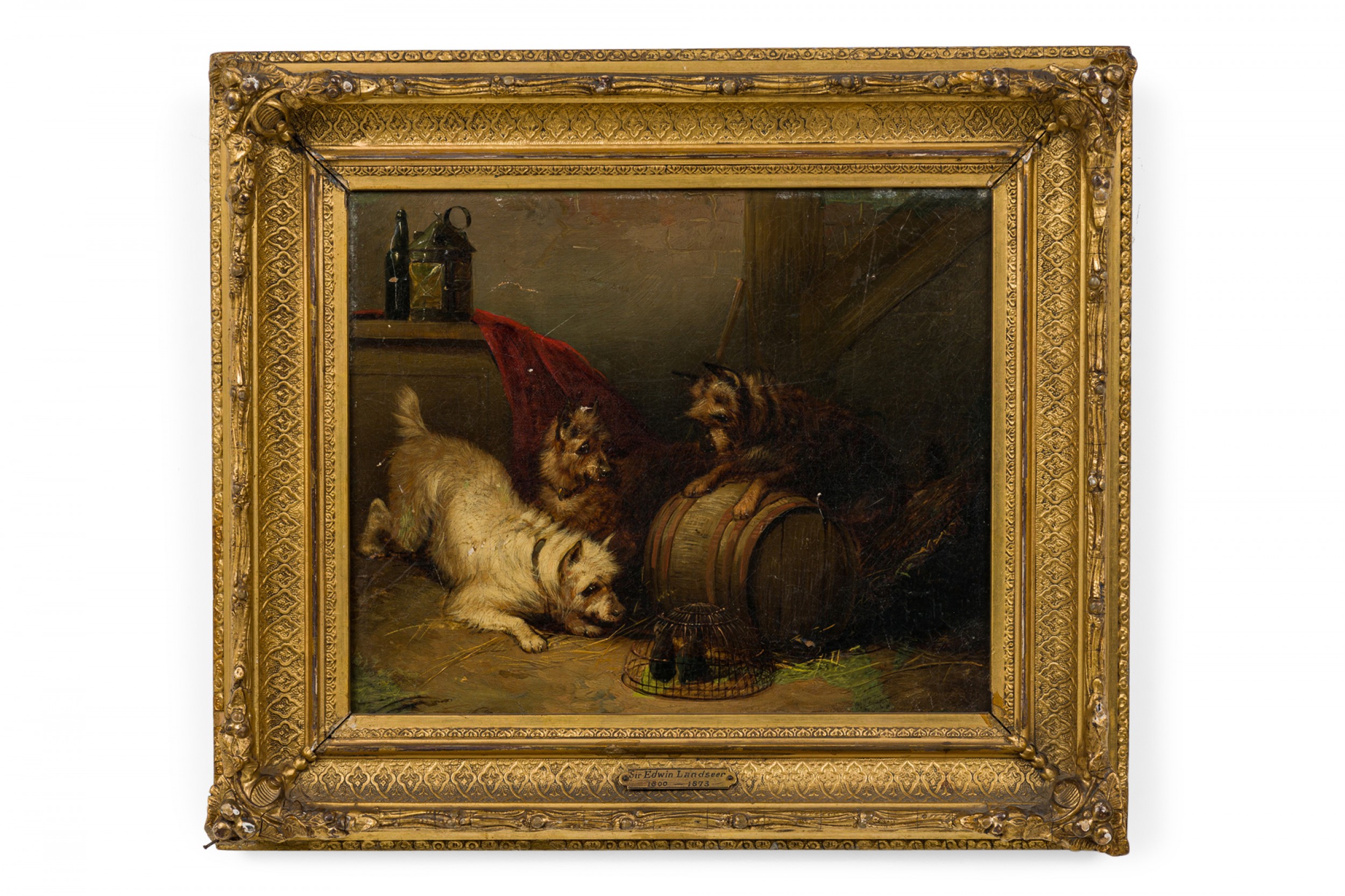 PAIR of English Victorian oil paintings in gilt carved frames of dogs stalking mice in a cage/animal in a hole in the ground. (by EDWIN LANDSEER) (repairs to canvas)