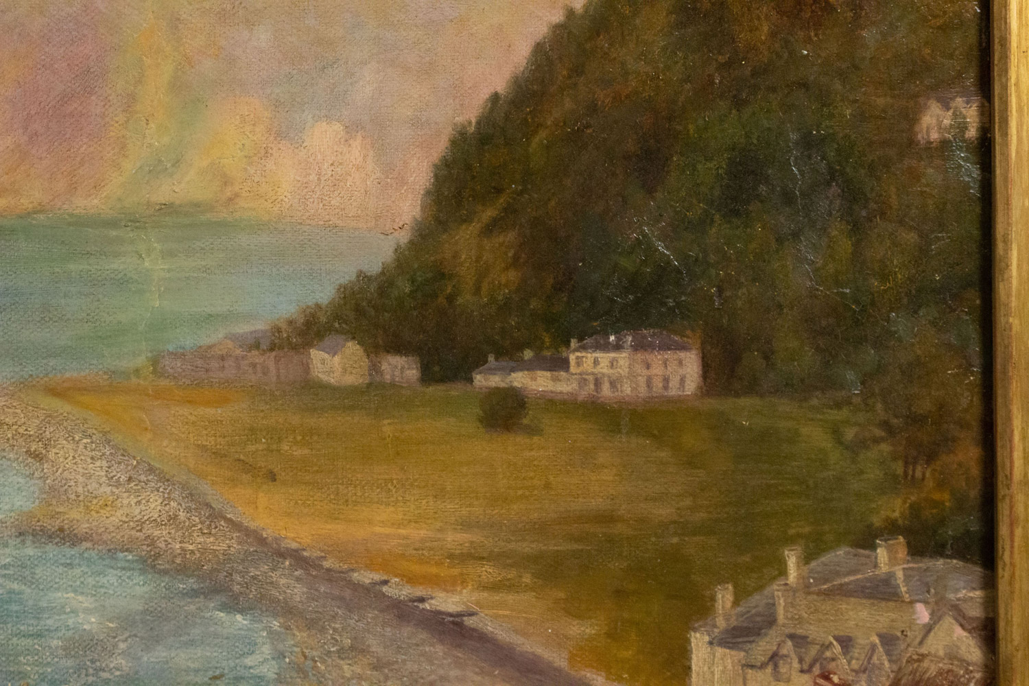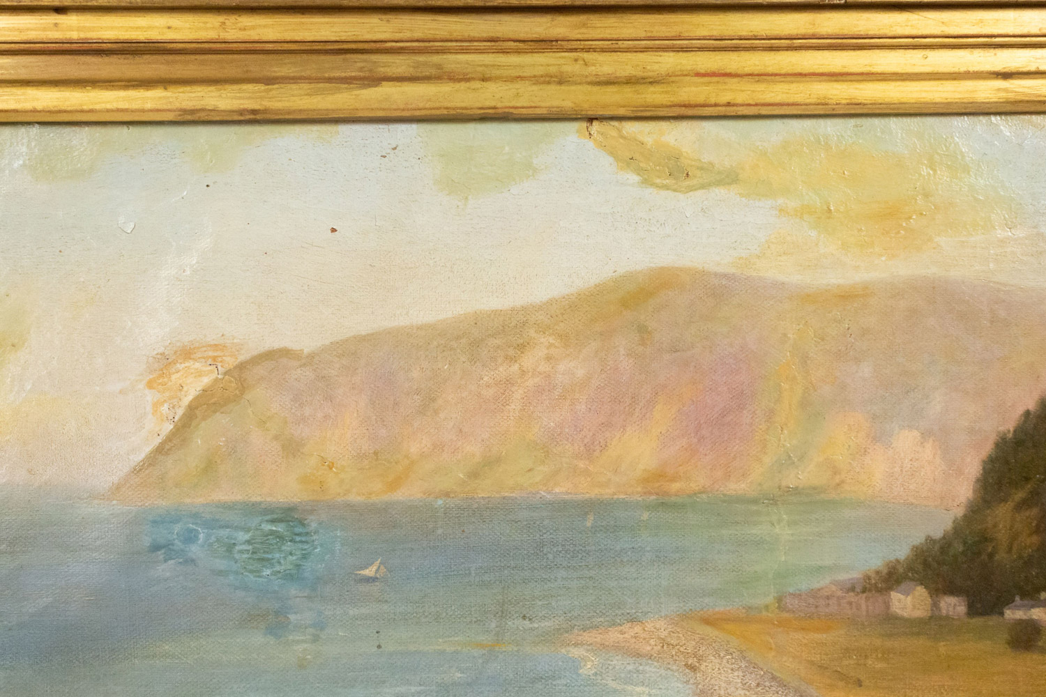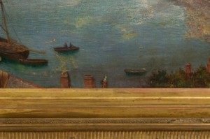 English Victorian gilt framed oil painting of fisherman in boat off coast (Haughton Fitzgerald).