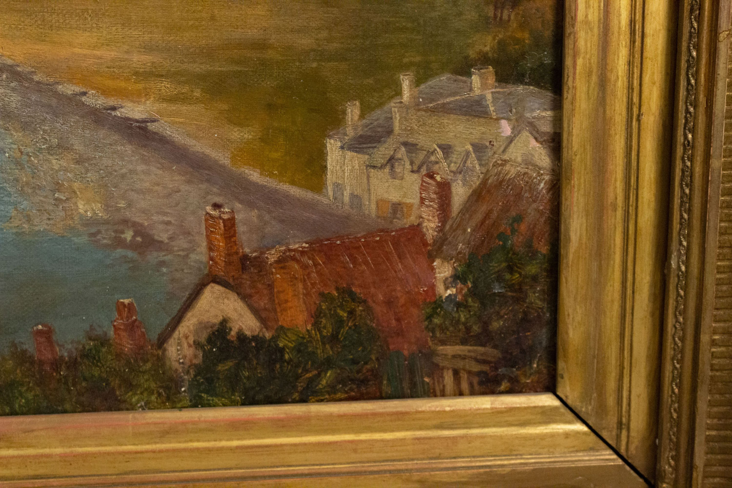 English Victorian gilt framed oil painting of fisherman in boat off coast (Haughton Fitzgerald)