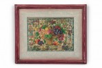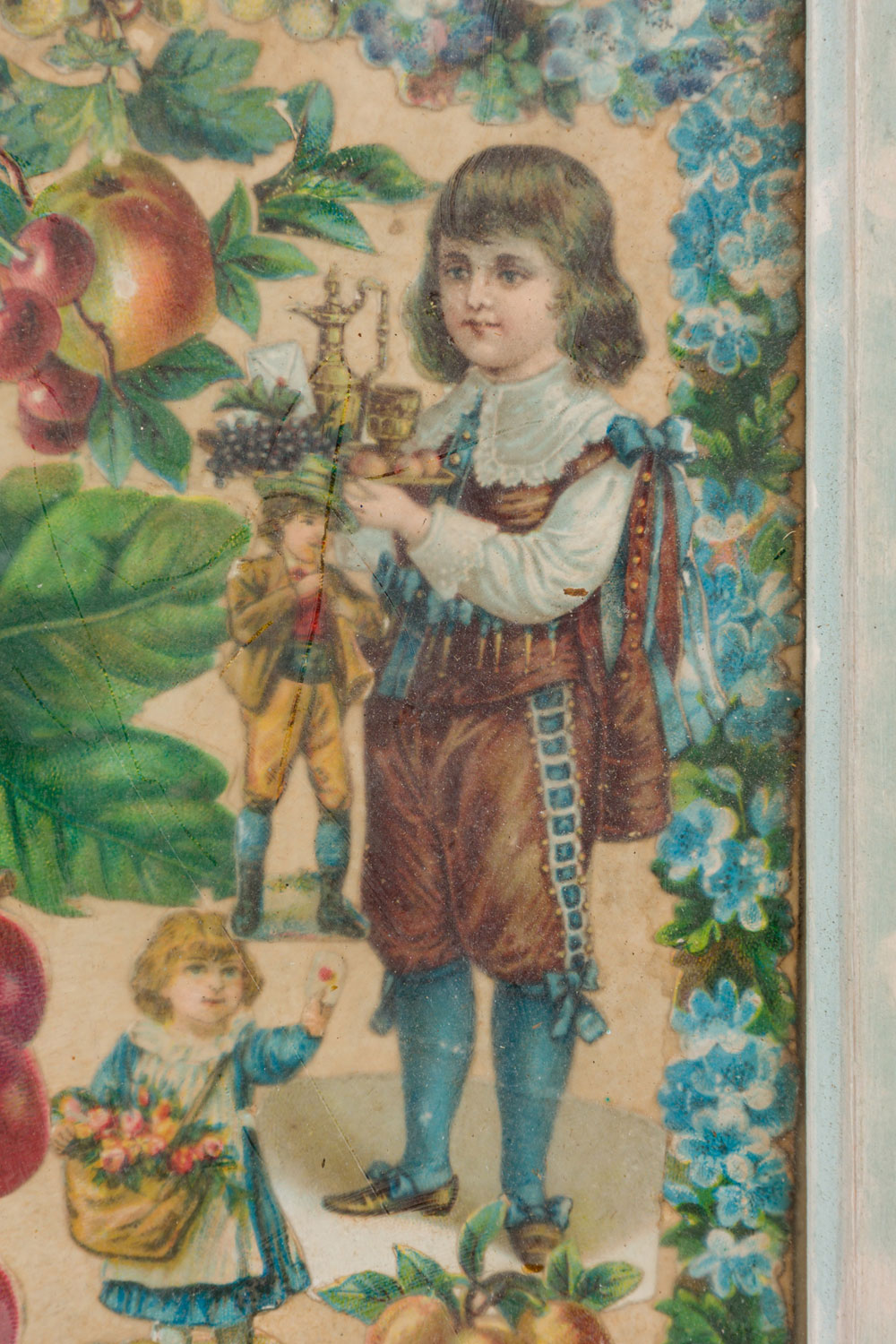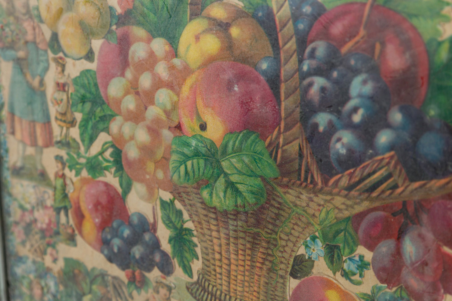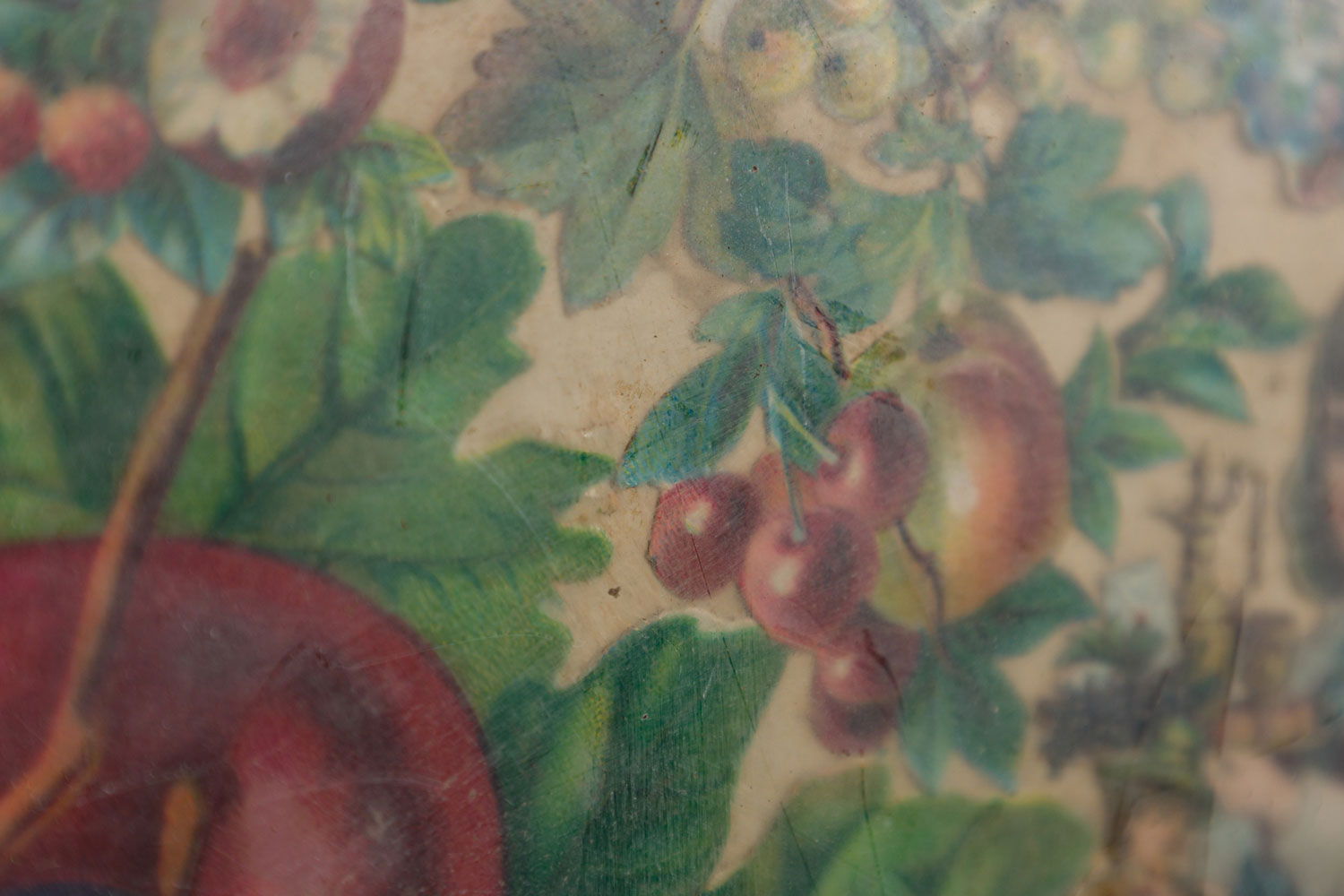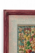 English Victorian red framed decoupage collage print picture of figures and fruit.