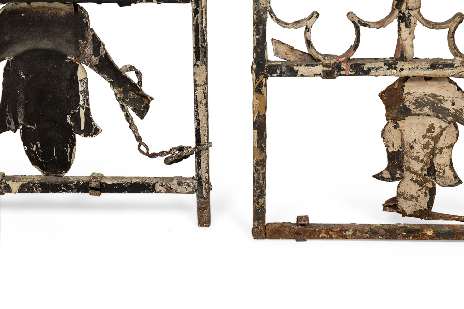 PAIR of English Victorian Gothic style (19/20th Century) painted iron gates with 4 flames on top and clover leaf design (PRICED AS PAIR).