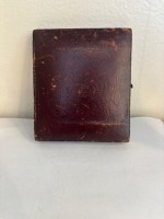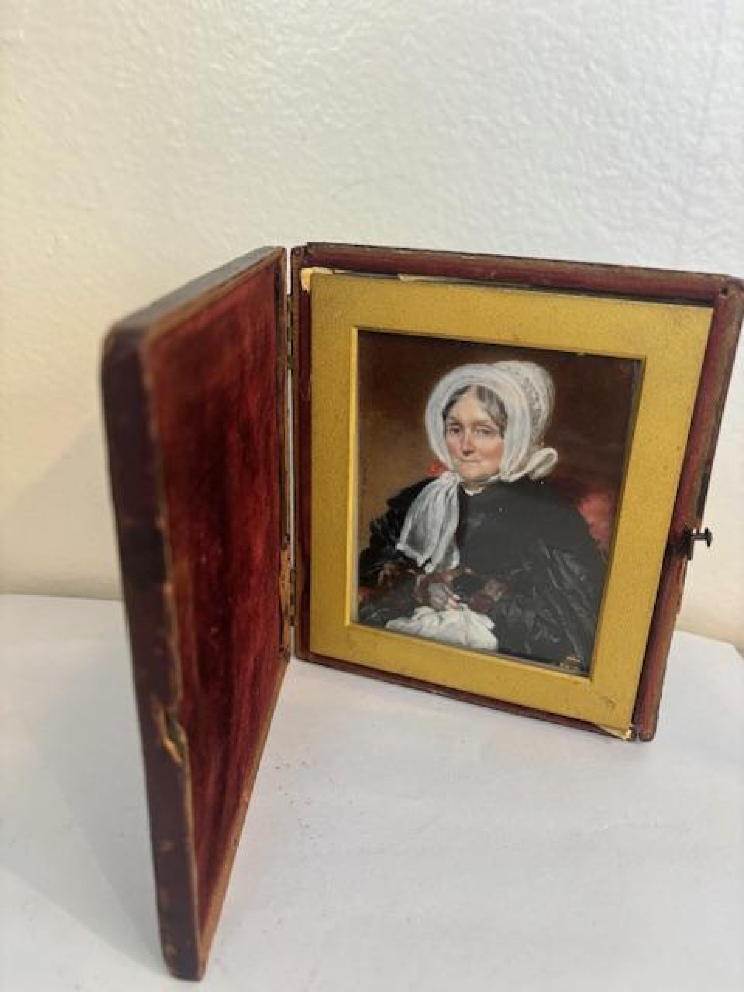 English Victorian miniature oil painting portrait of a seated lady wearing a black dress and white bonnet in maroon leather case (signed: C(harles) J BASEBE 1841)