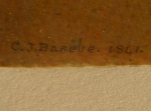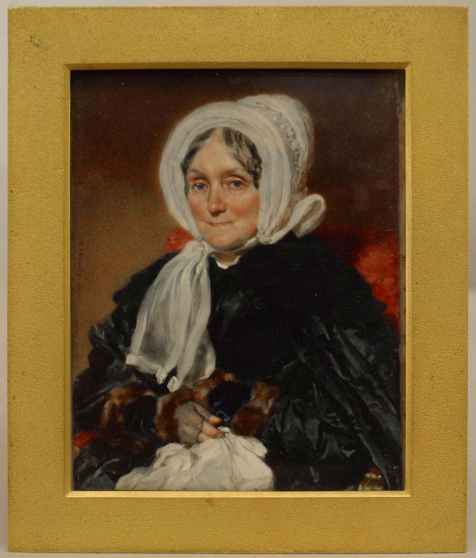 English Victorian miniature oil painting portrait of a seated lady wearing a black dress and white bonnet in maroon leather case (signed: C(harles) J BASEBE 1841).