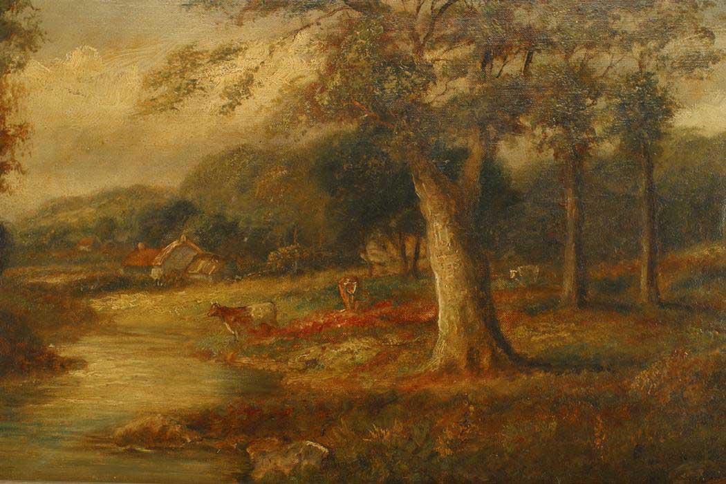 English Victorian style gilt framed oil painting of a landscape with cows by stream and trees (similar to 053573)