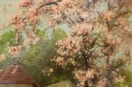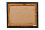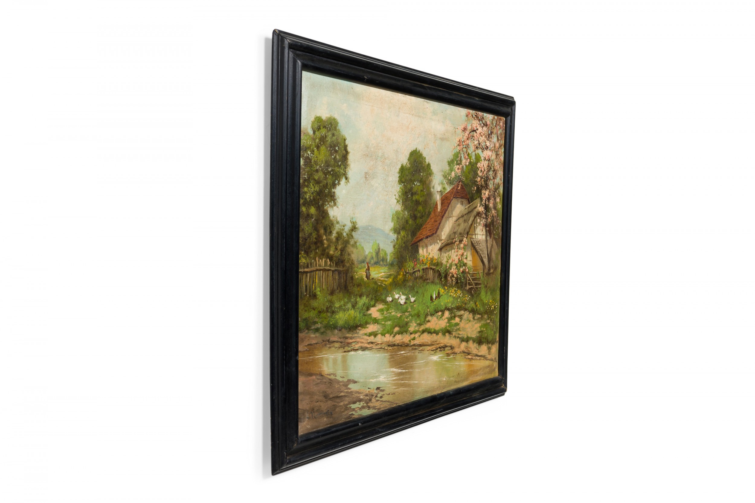 English Victorian ebonized framed oil landscape painting of creek by house with chickens. (signed)