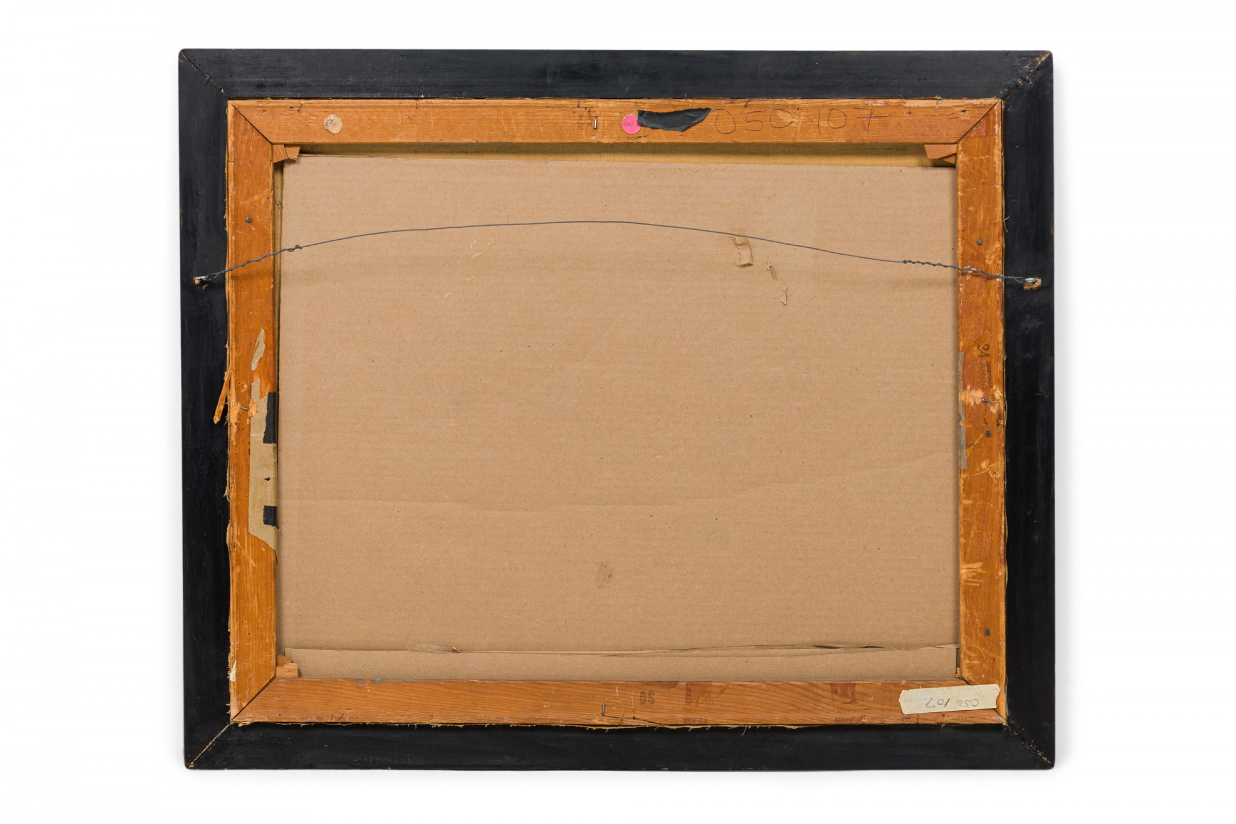 English Victorian ebonized framed oil landscape painting of creek by house with chickens. (signed).