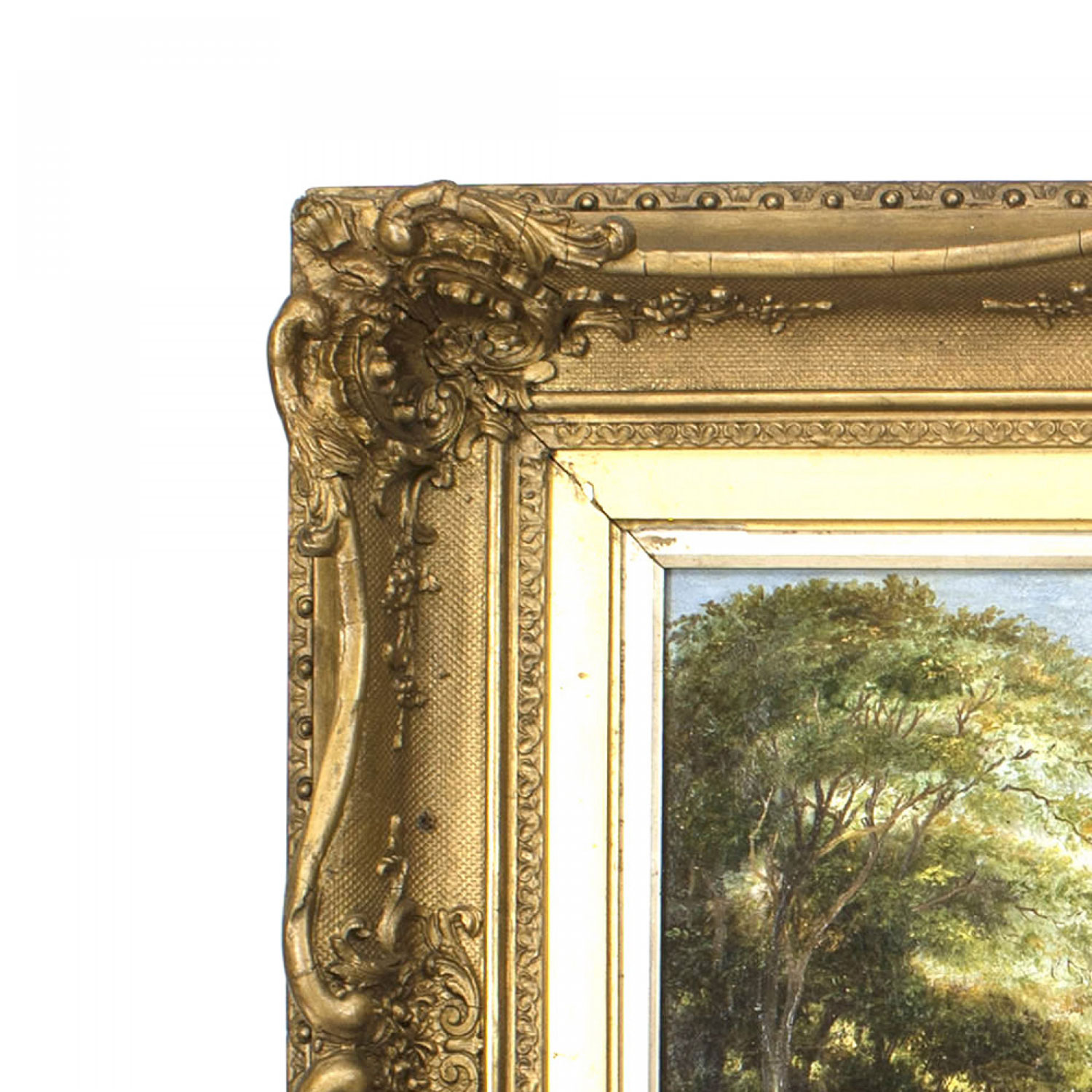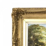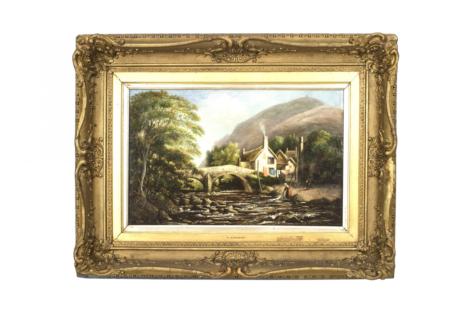 English Victorian gilt framed oil landscape painting of lady bathing on rocky creek near bridge. (signed VINCENT).