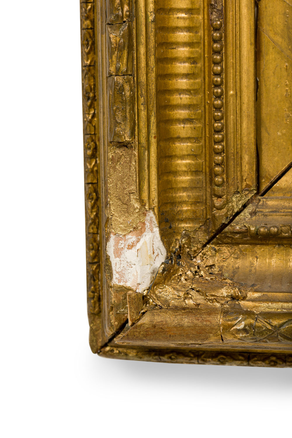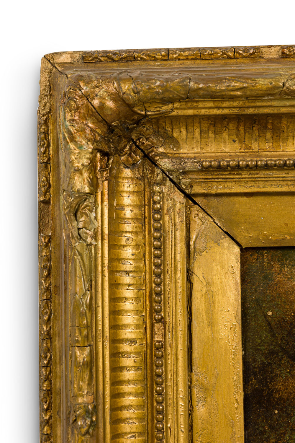 English Victorian gilt framed oil painting of lady in vertical forest landscape with sticks on back (H. Reynold).
