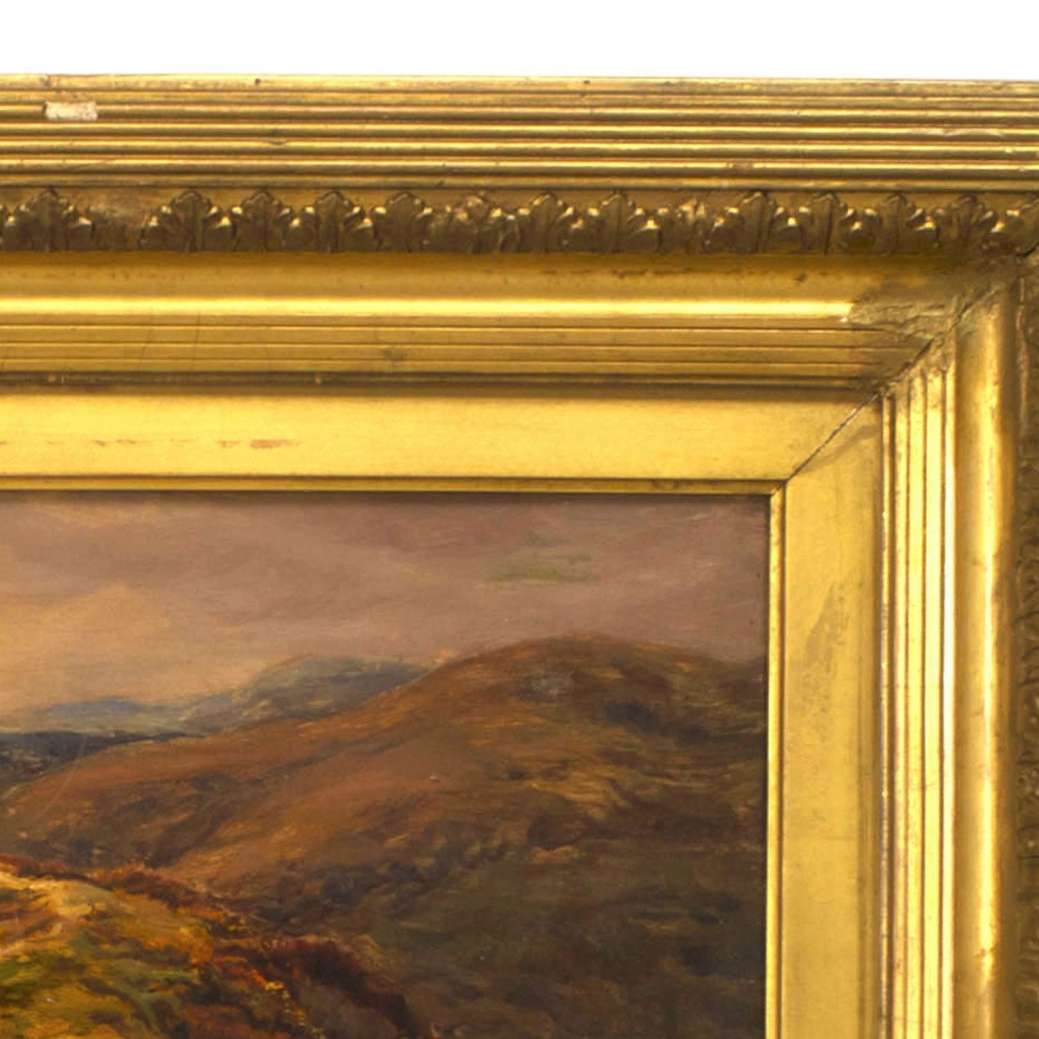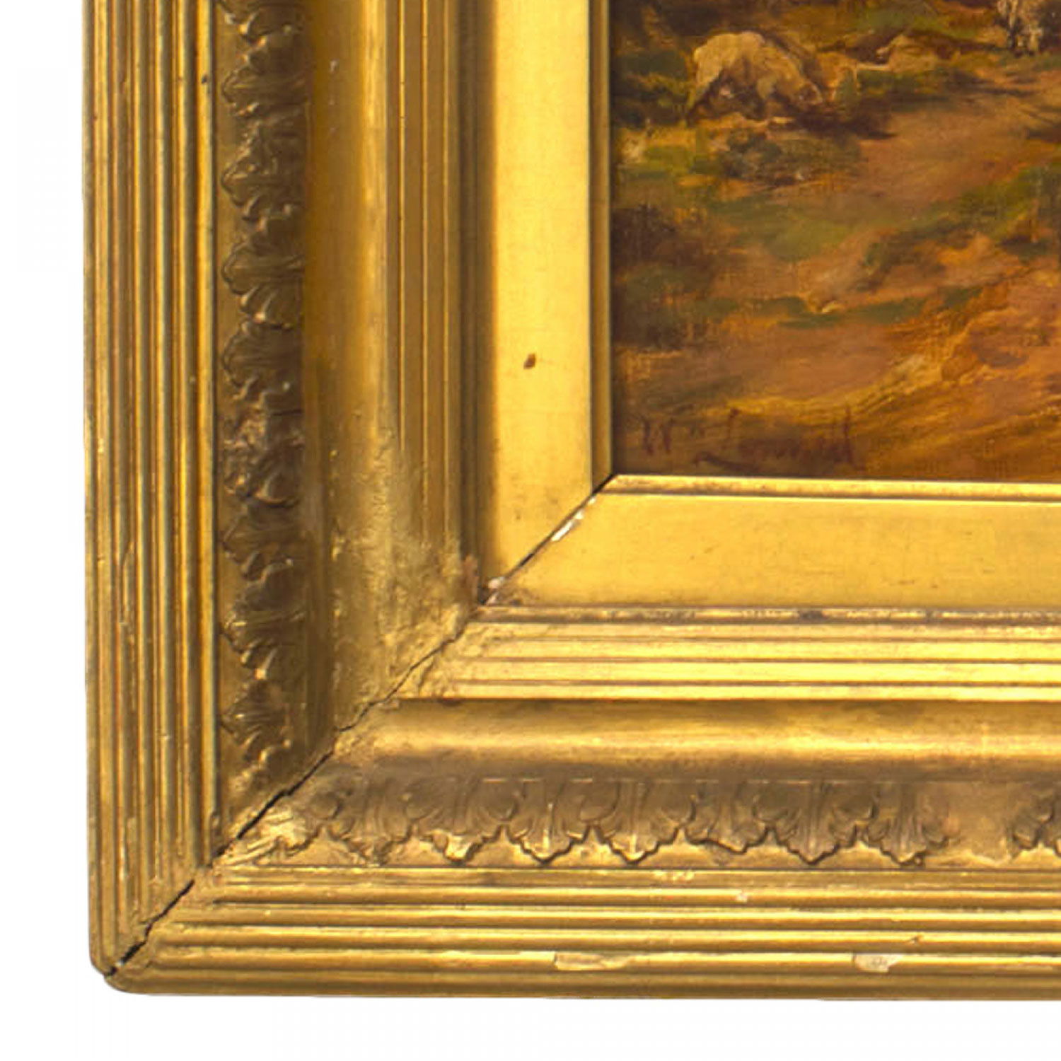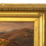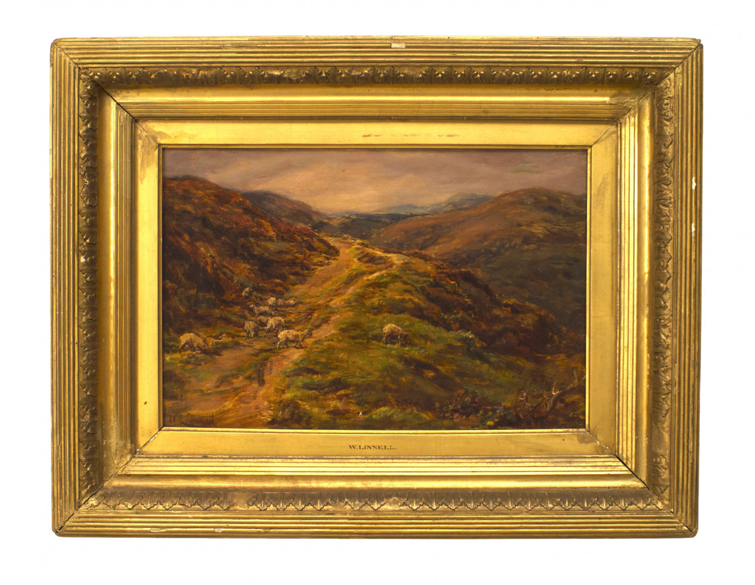 English Victorian (19th Cent) oil painting of sheep in a landscape by William Linnel (British, 1826-1906) in gilt frame.