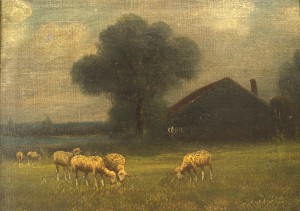 English Victorian gilt framed landscape oil painting of herd of sheep grazing near a house.