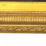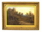 English Victorian gilt framed oil painting of landscape with lady crossing small bridge while holding twigs. (signed)