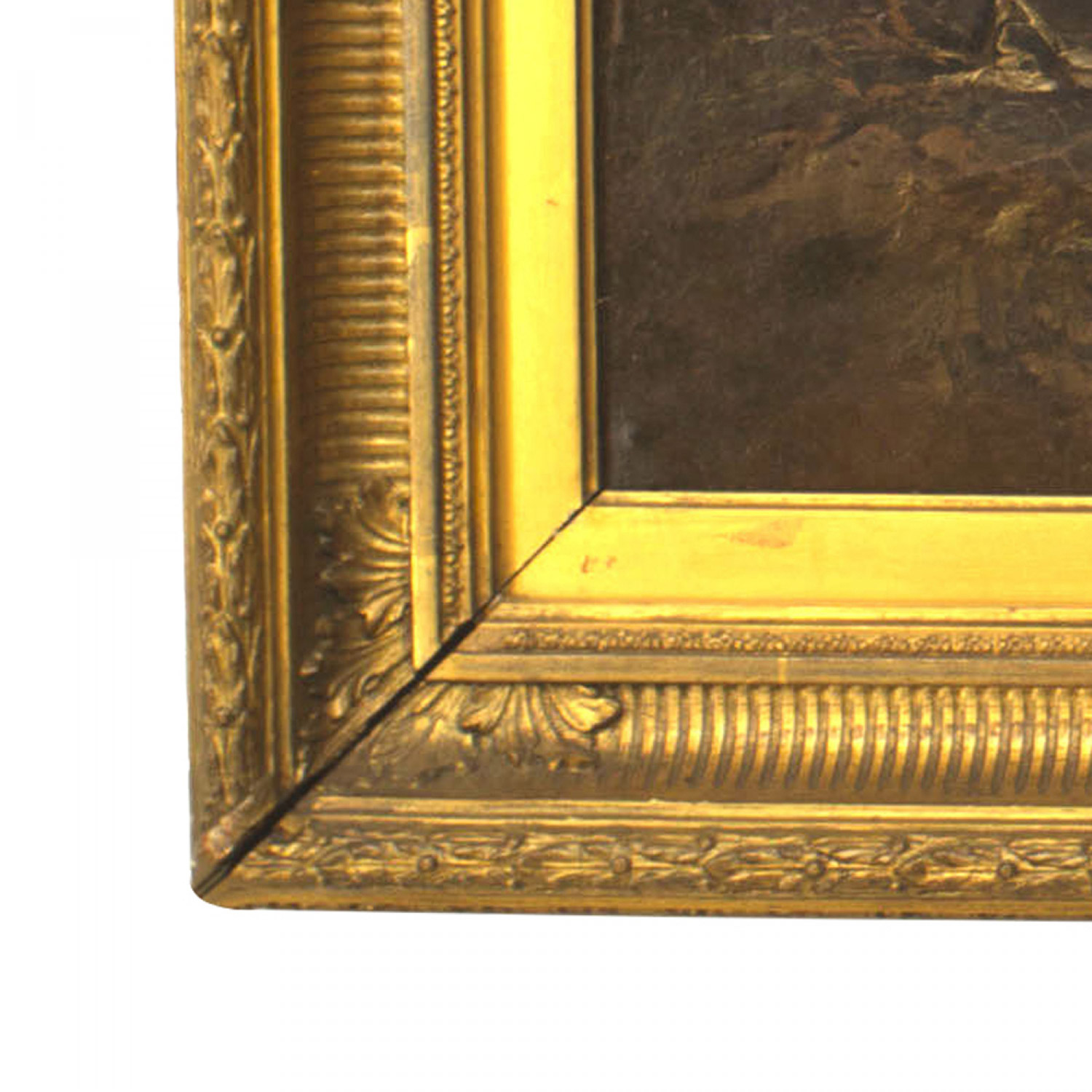 English Victorian gilt framed oil painting of landscape with lady crossing small bridge while holding twigs. (signed).