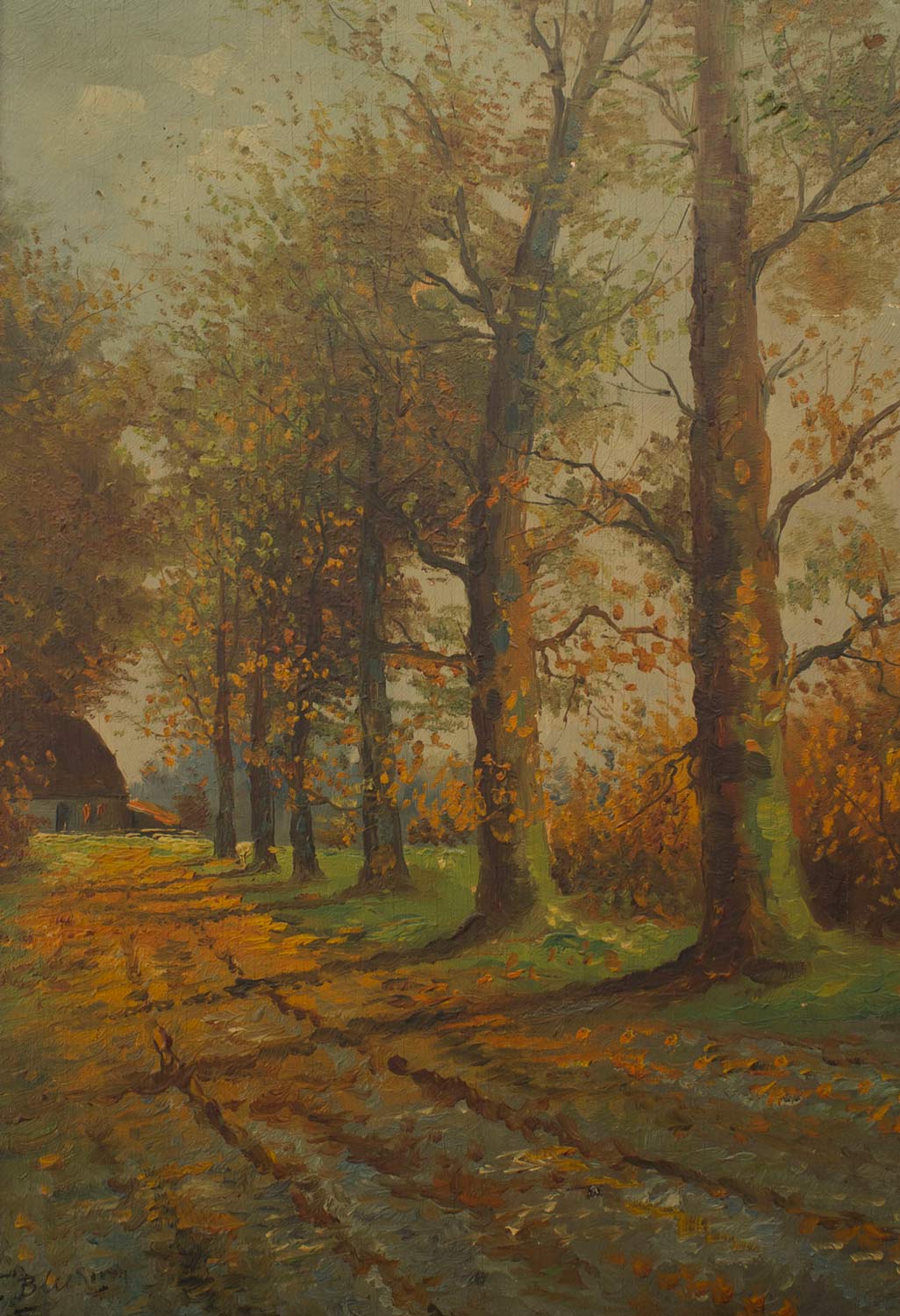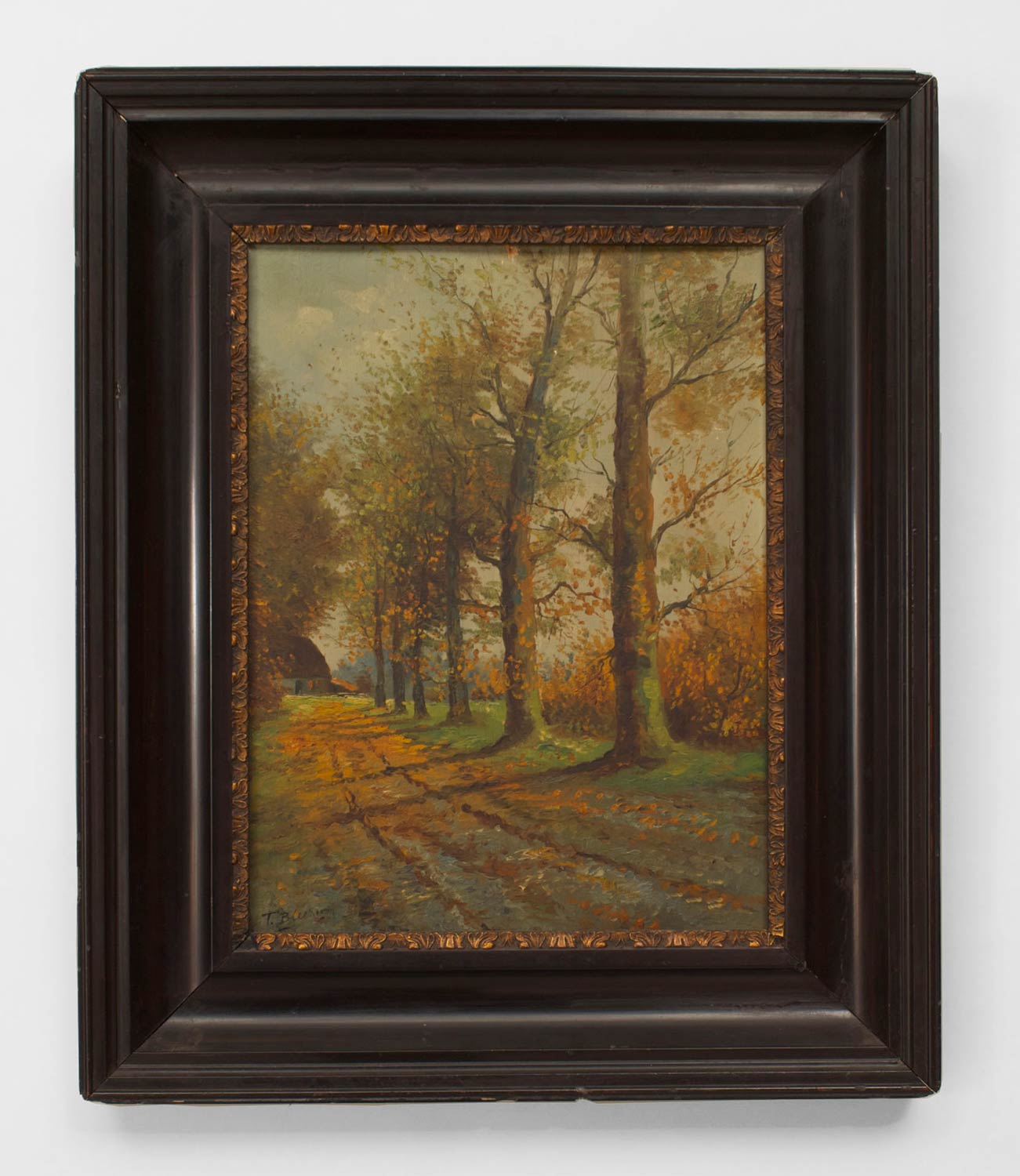 English Victorian black framed oil vertical landscape painting on board with 6 tall trees by road