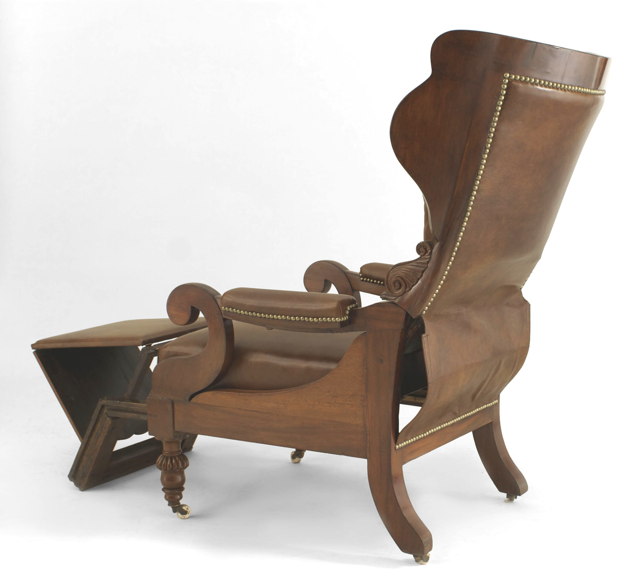 English Victorian (2nd Quarter 19th Century) mahogany reclining adjustable arm chair with foot rest and upholstered in brown leather having a tufted round back with nail head trim.