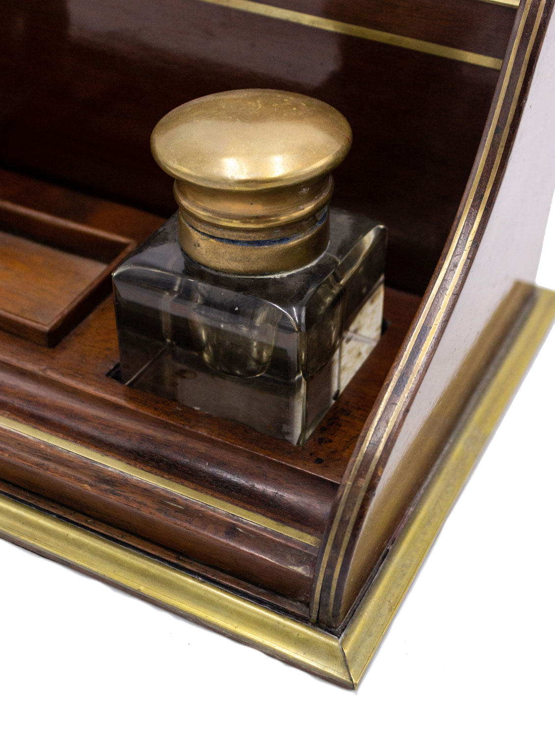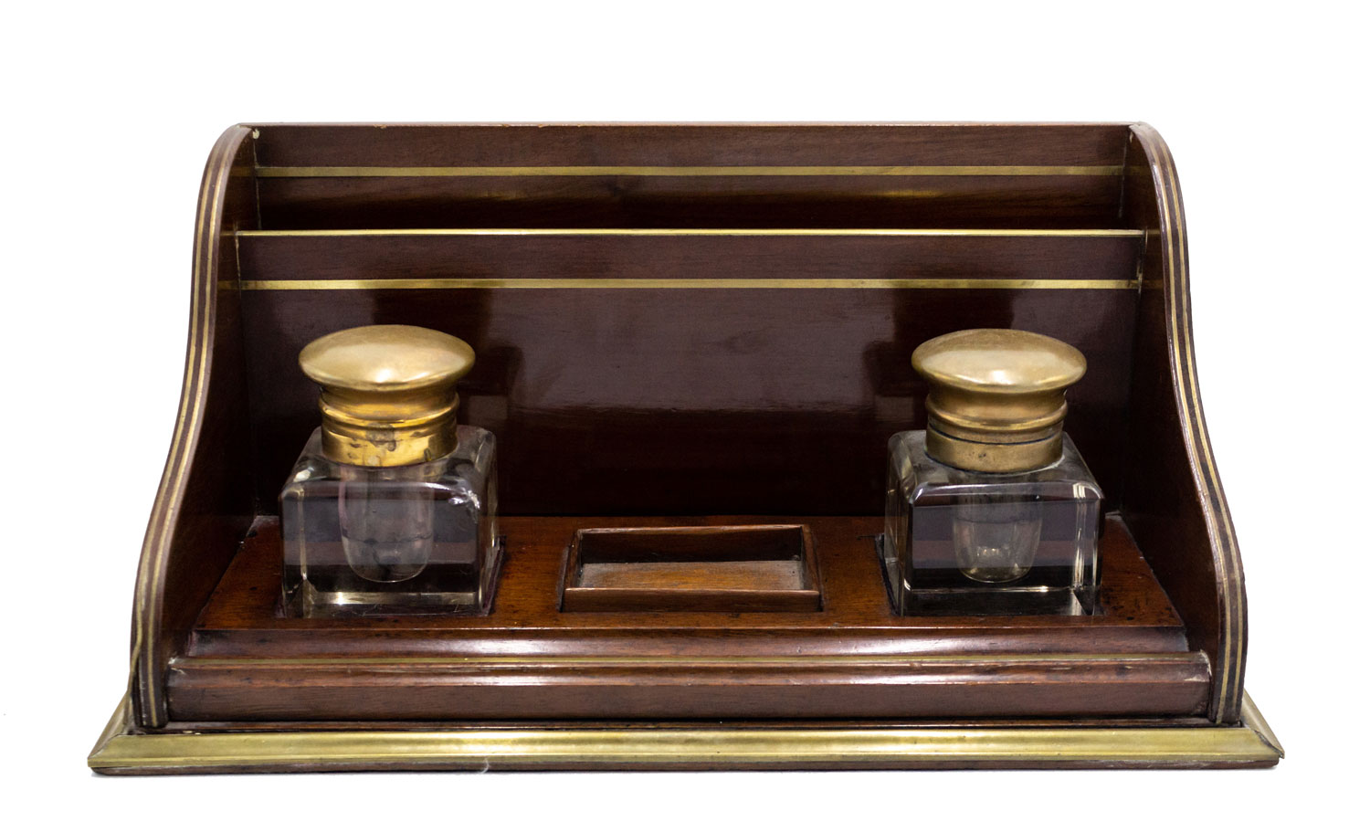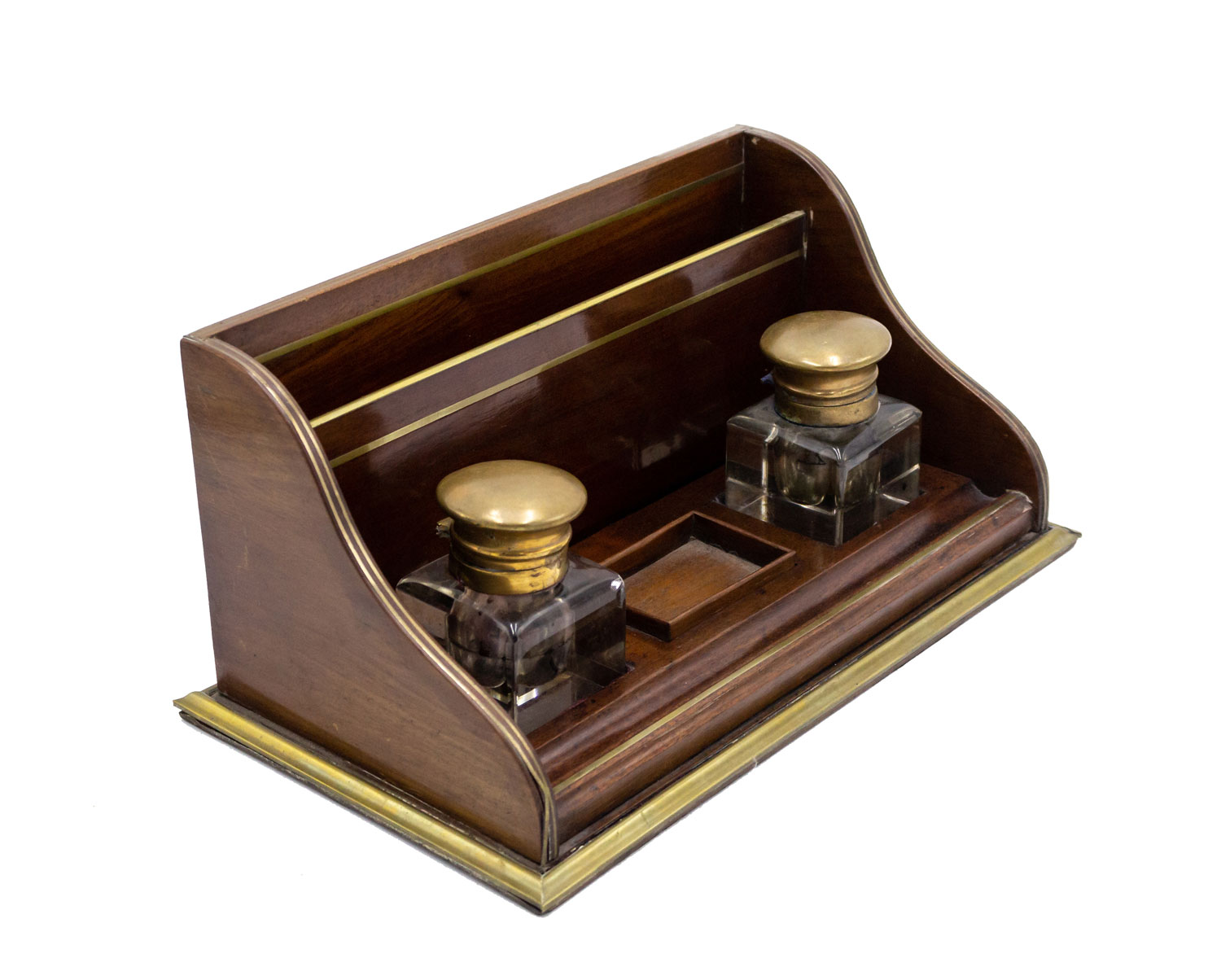 English Victorian mahogany and brass inlaid trim double inkwell with crystal wells having copper top lids and letter holder backrail.