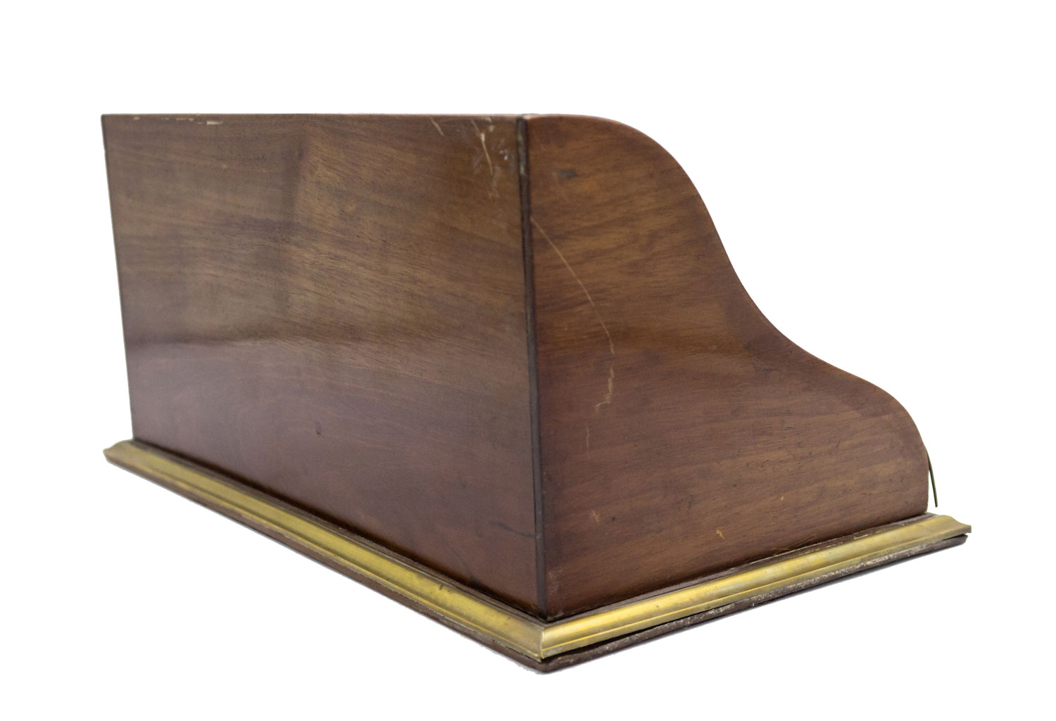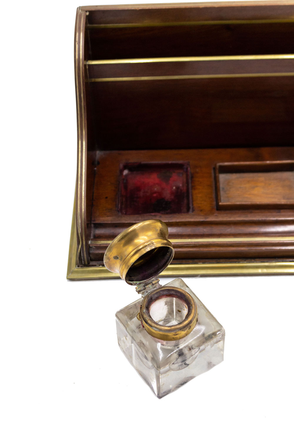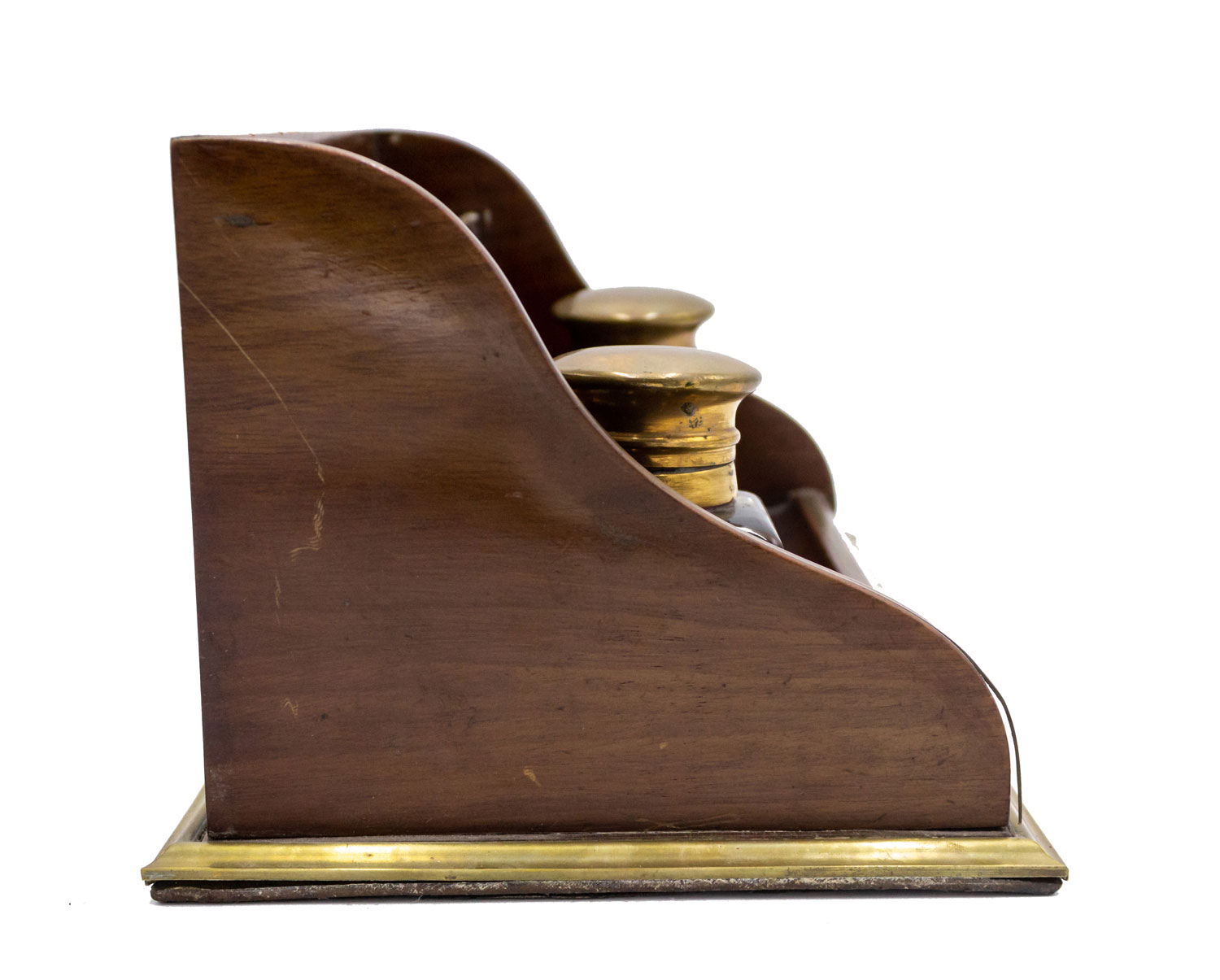 English Victorian mahogany and brass inlaid trim double inkwell with crystal wells having copper top lids and letter holder backrail.