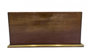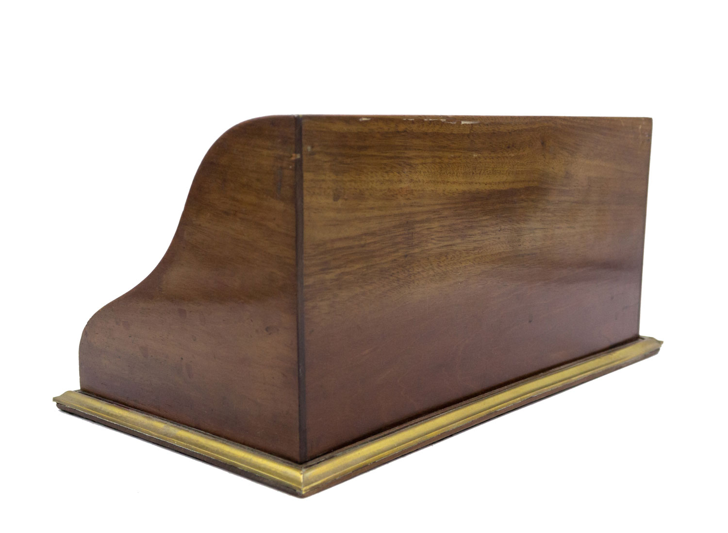 English Victorian mahogany and brass inlaid trim double inkwell with crystal wells having copper top lids and letter holder backrail..