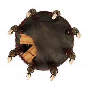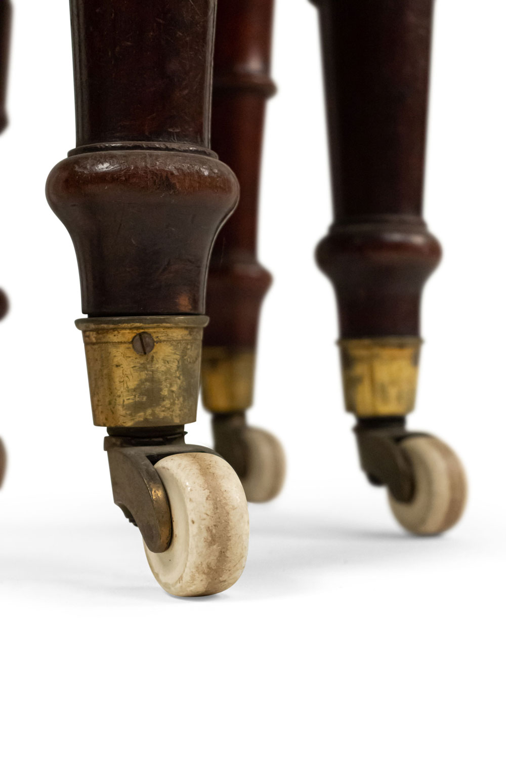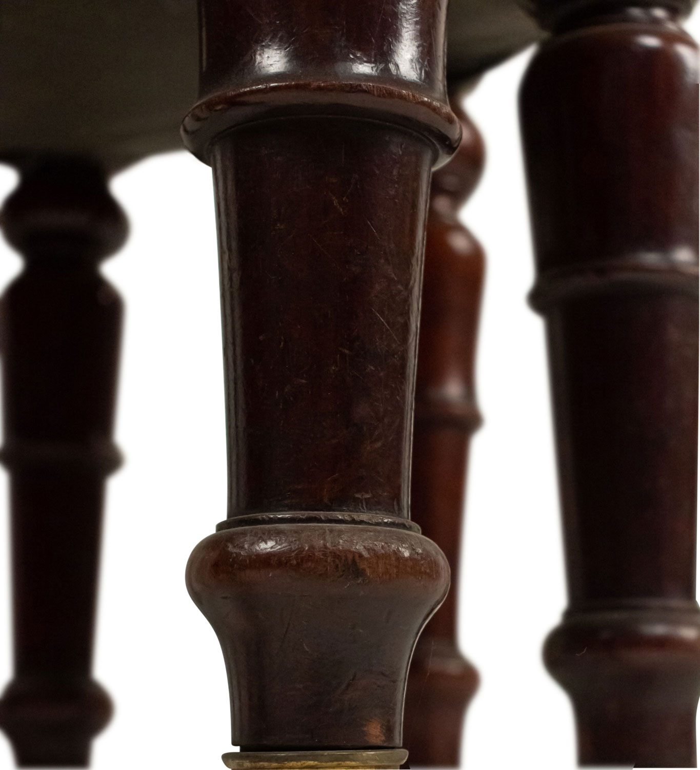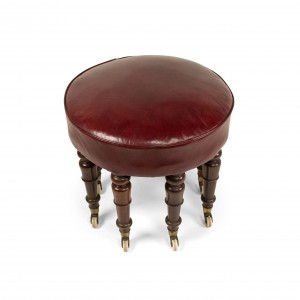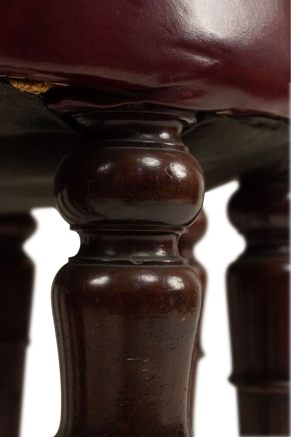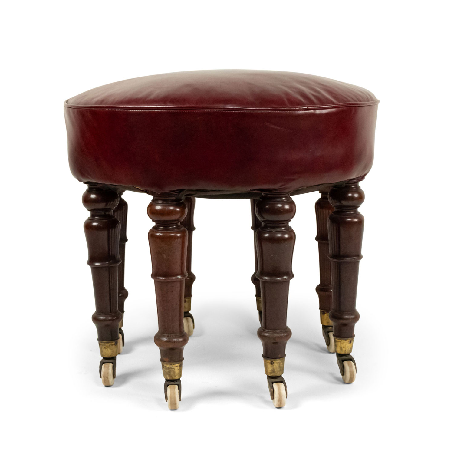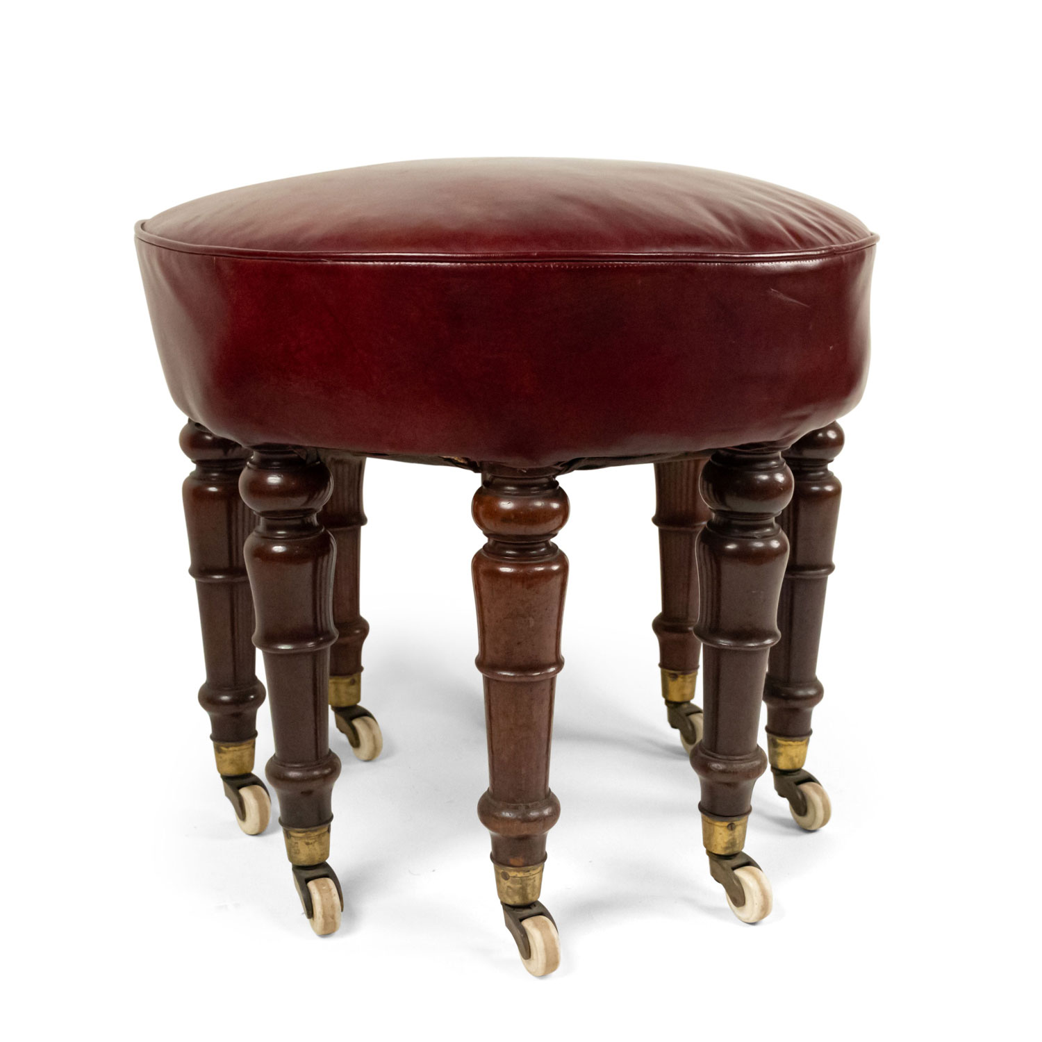 English Victorian (circa 1875) mahogany round 8 legged bench on casters with a dark maroon leather seat..