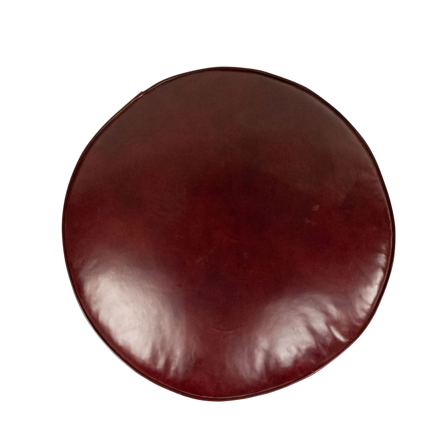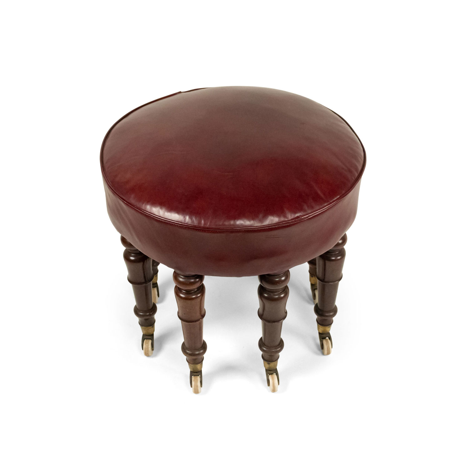 English Victorian (circa 1875) mahogany round 8 legged bench on casters with a dark maroon leather seat.
