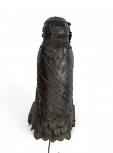 English Victorian metal table lamp of owl standing on 2 books with door in front.