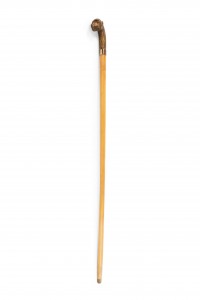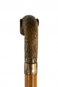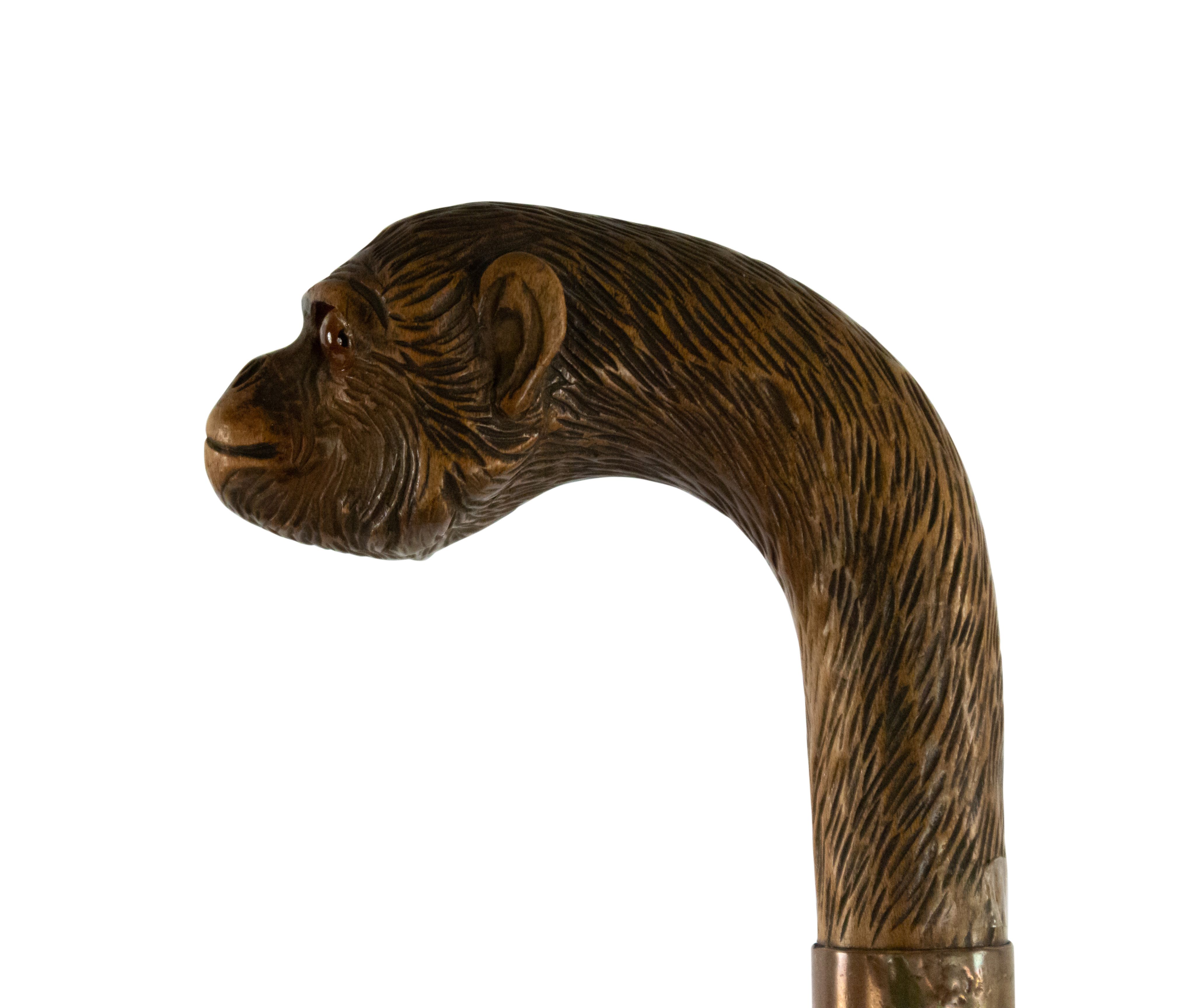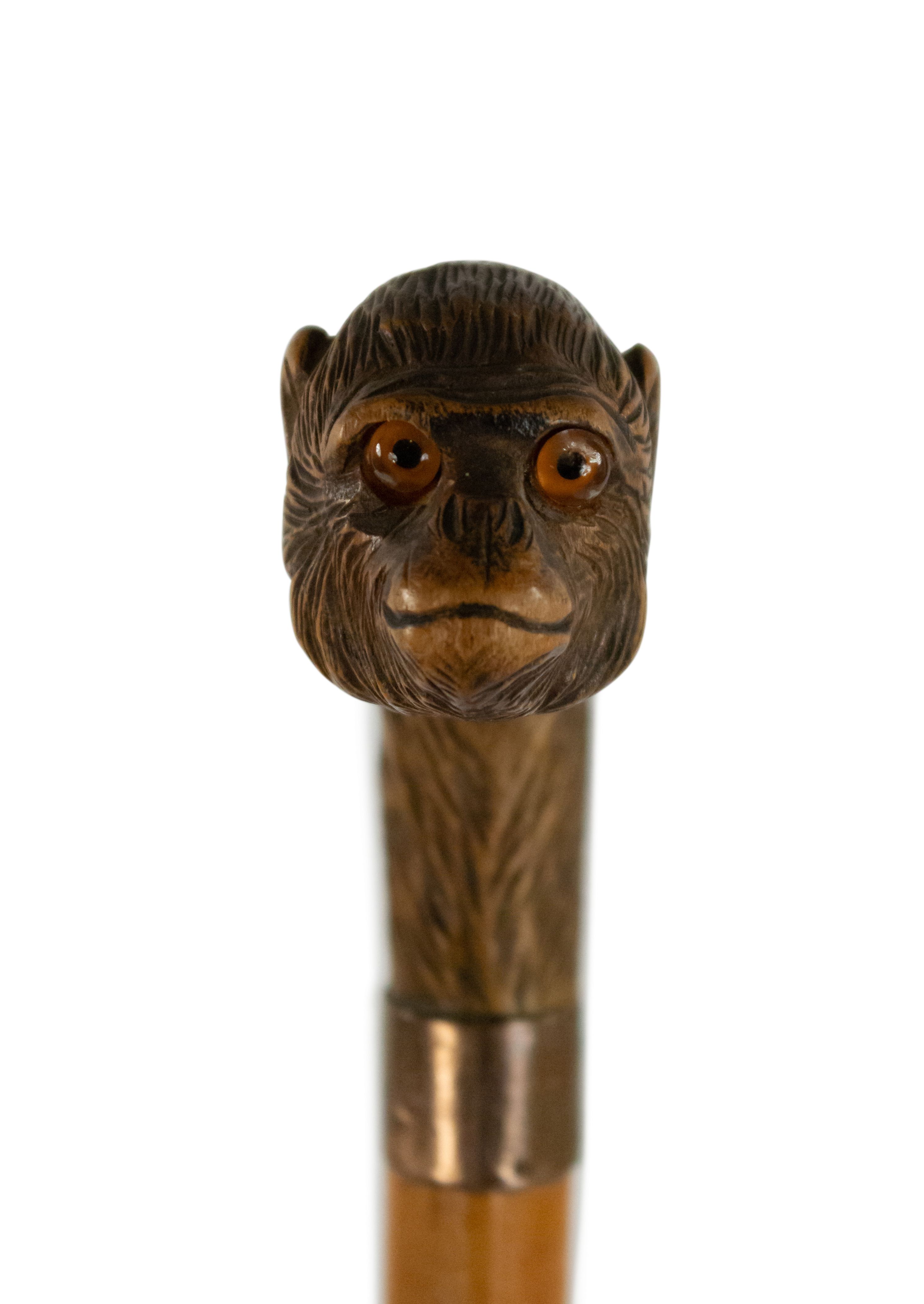 English Victorian walking cane with light wood shaft and handle carved as monkey head with copper collar