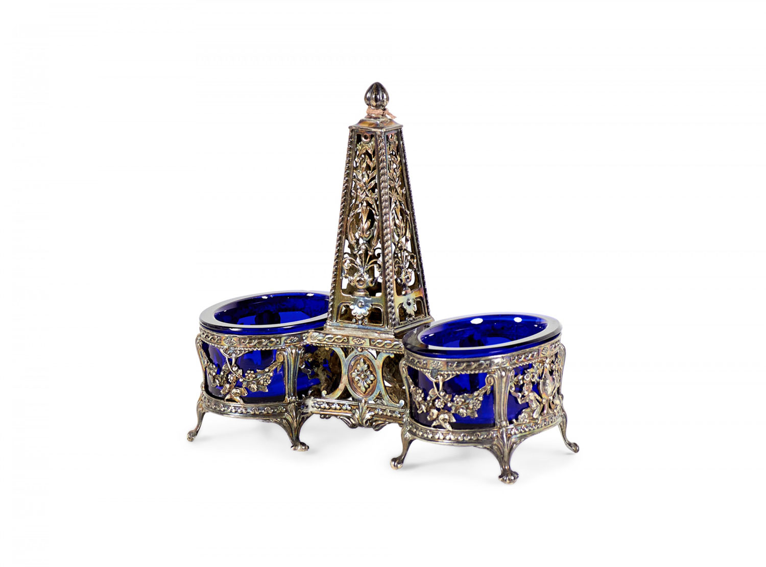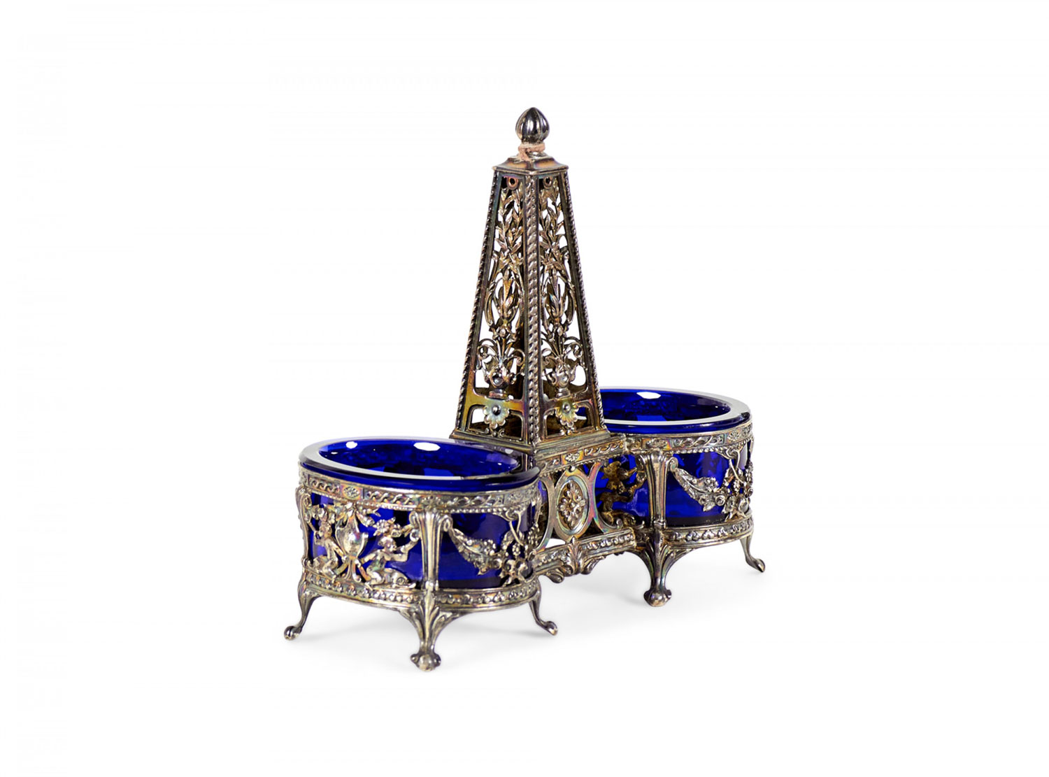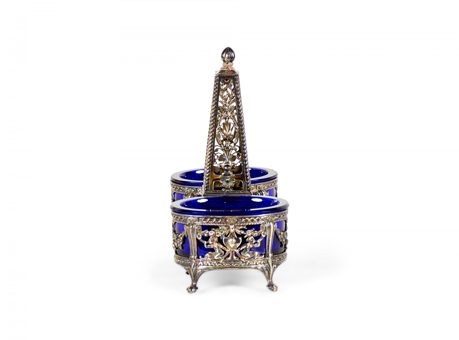 English Victorian double sided salt cellar with obelisk center and 2 blue glass liners..