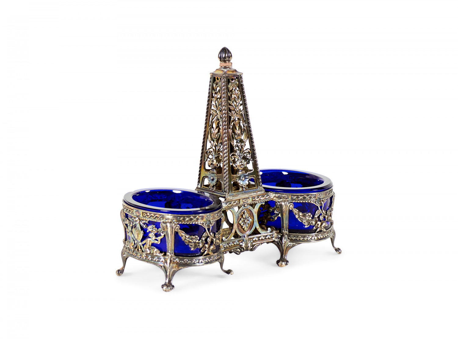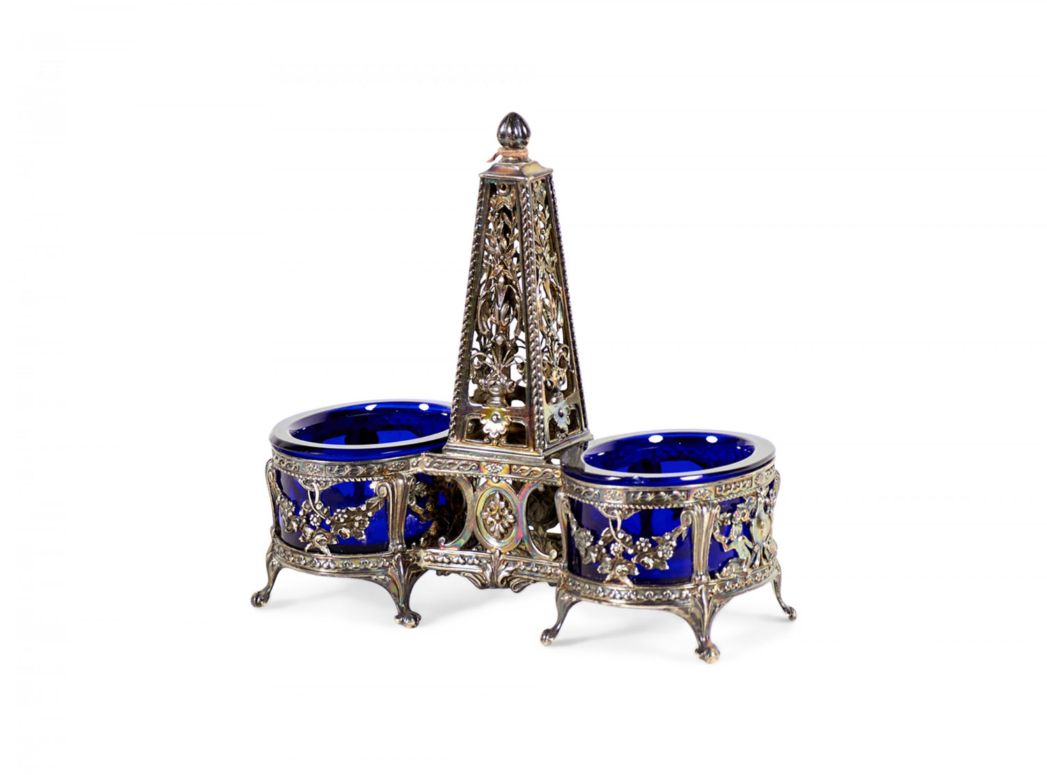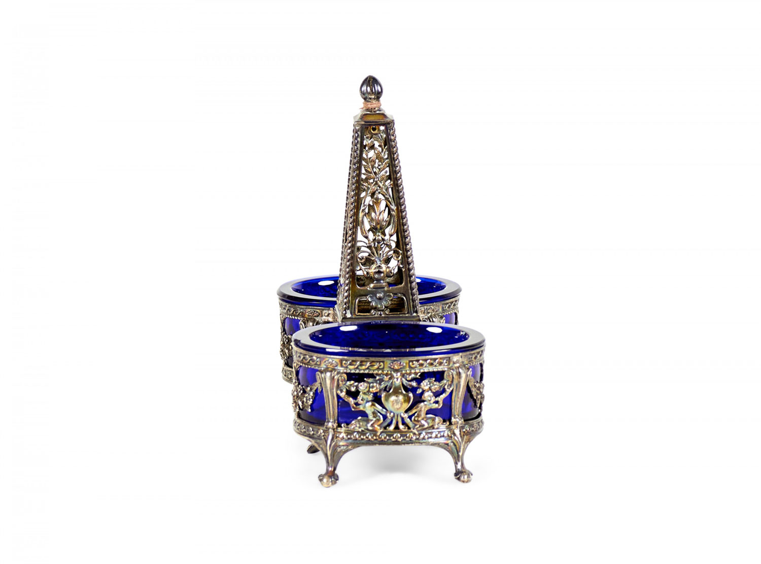English Victorian double sided salt cellar with obelisk center and 2 blue glass liners..