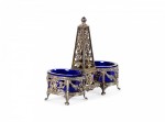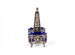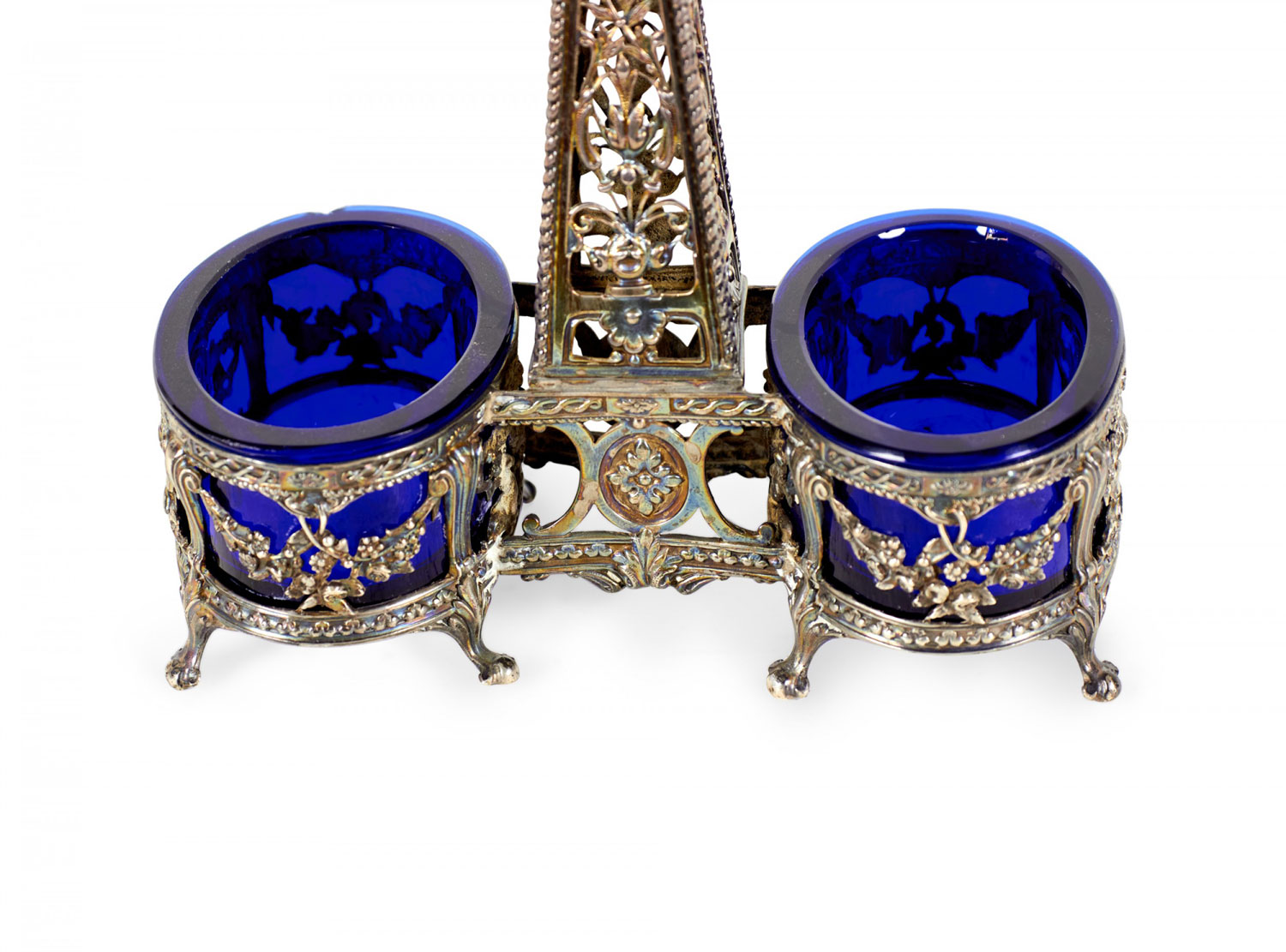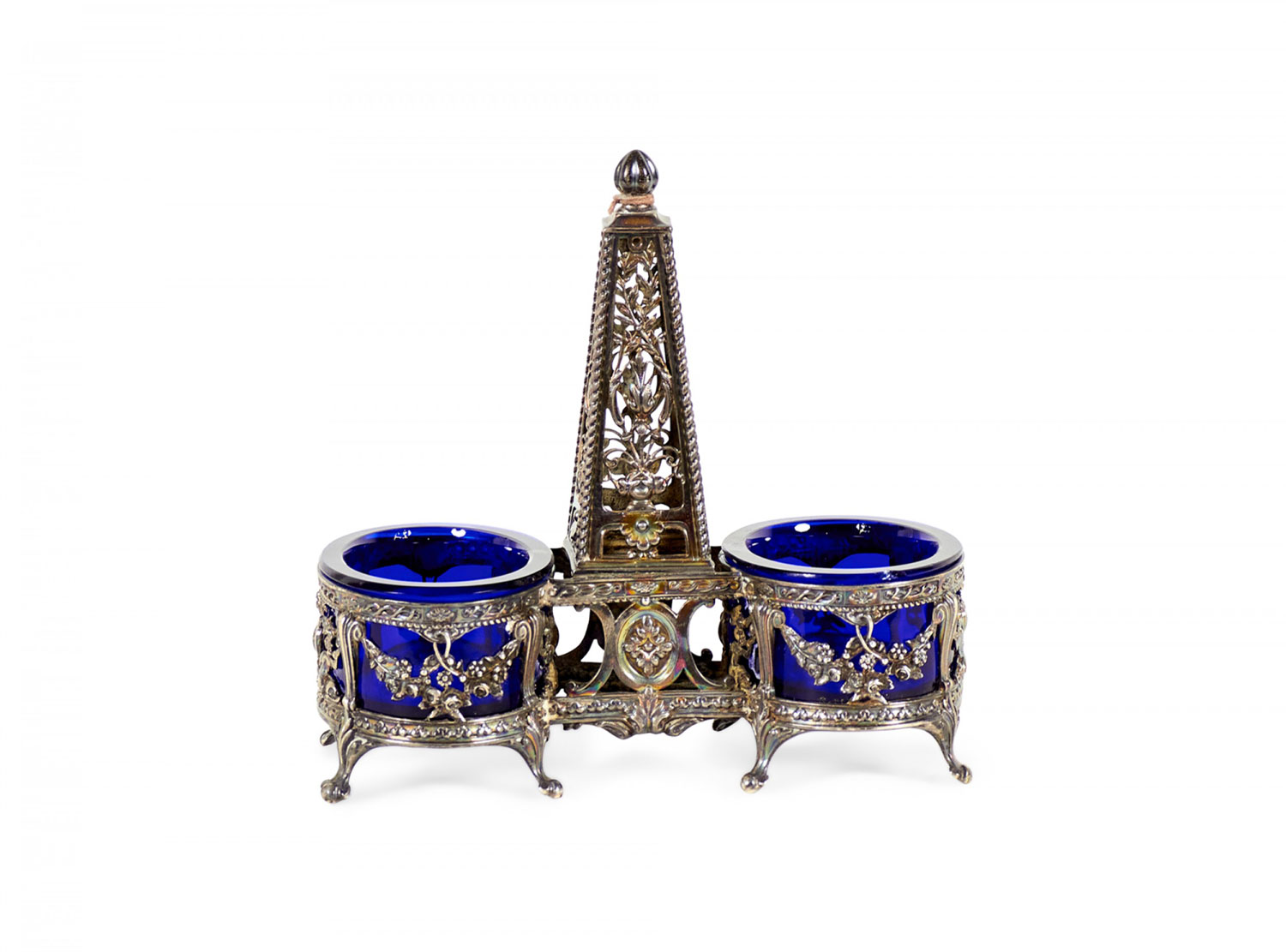 English Victorian double sided salt cellar with obelisk center and 2 blue glass liners.