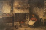 English Victorian (19th Cent) oil painting domestic scene of lady in chair by fireplace in gilt frame. (signed)