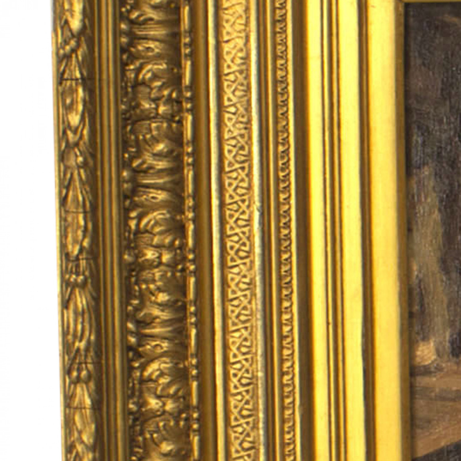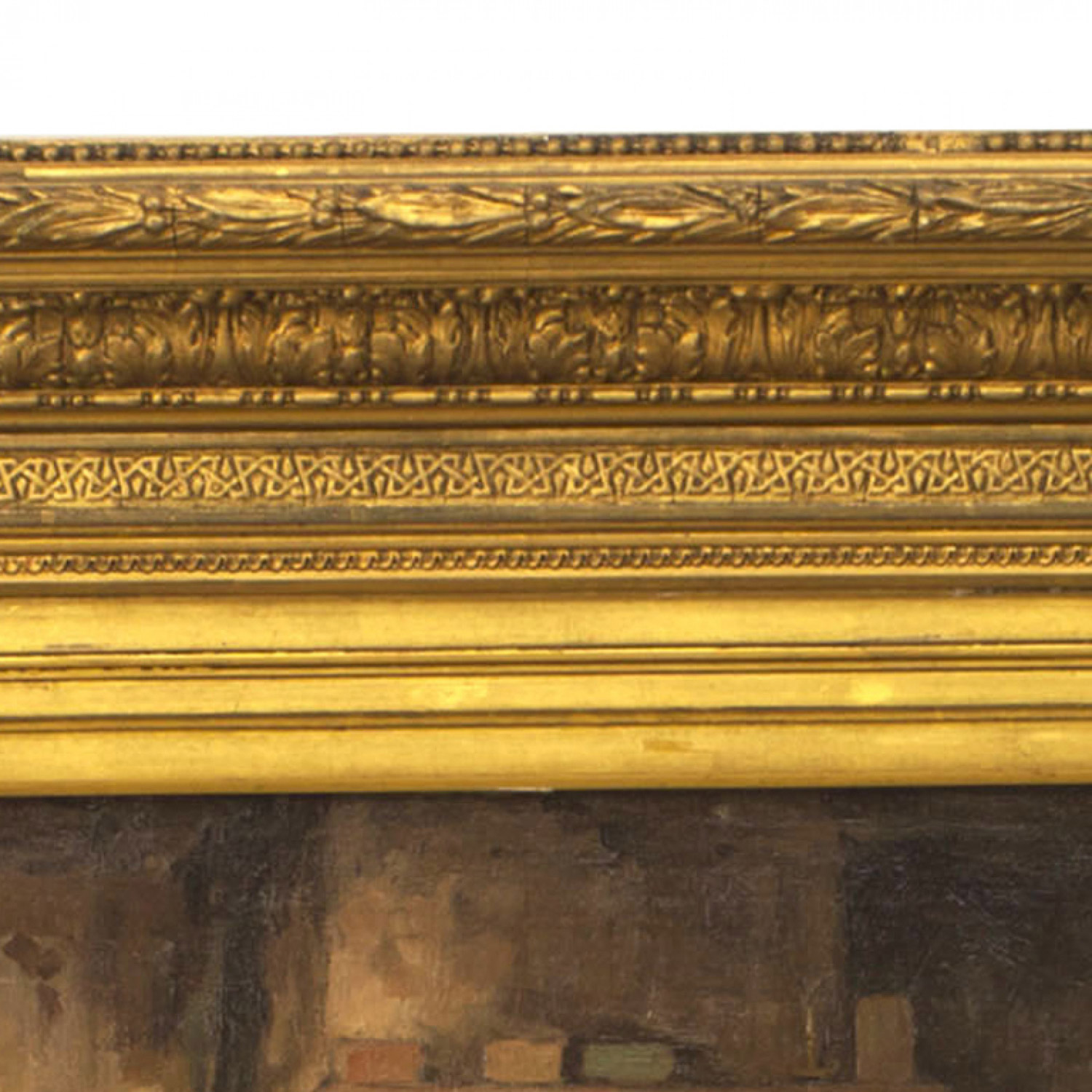 English Victorian (19th Cent) oil painting domestic scene of lady in chair by fireplace in gilt frame. (signed).