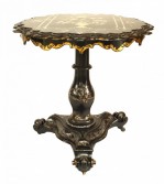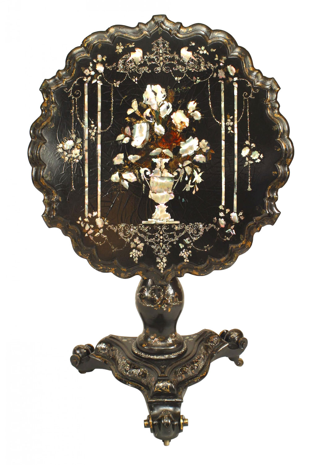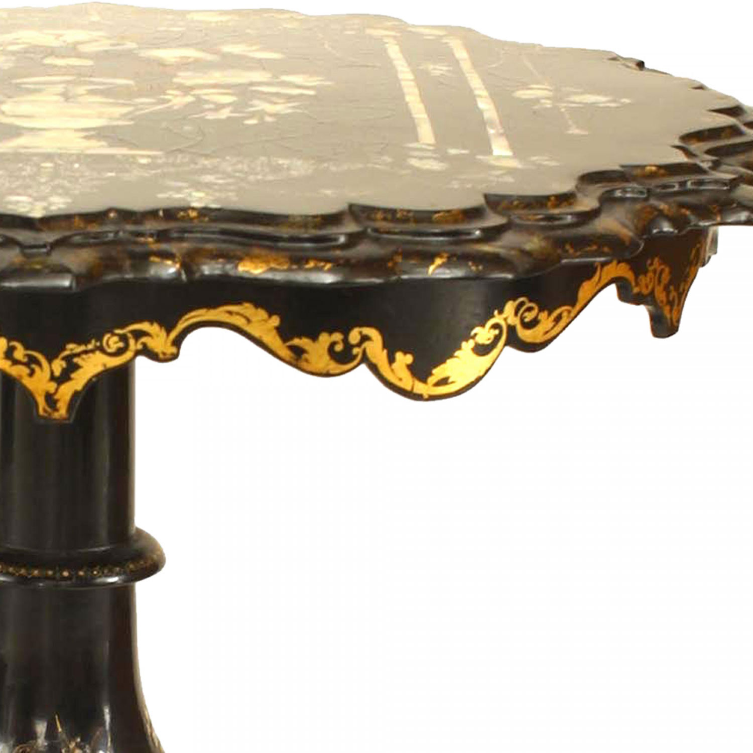 Style: English Materials & Techniques: Pearl, lacquered, inlaid, scalloped Category: Tables Condition: Antique condition, shows its age.
