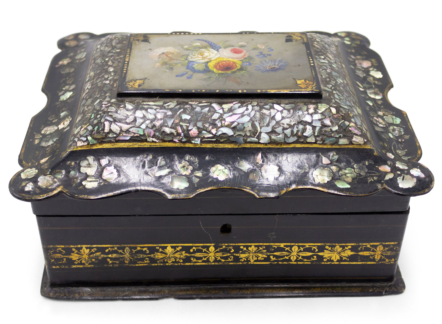 English Victorian papier mache pearl inlaid box with scalloped and floral painted top