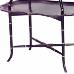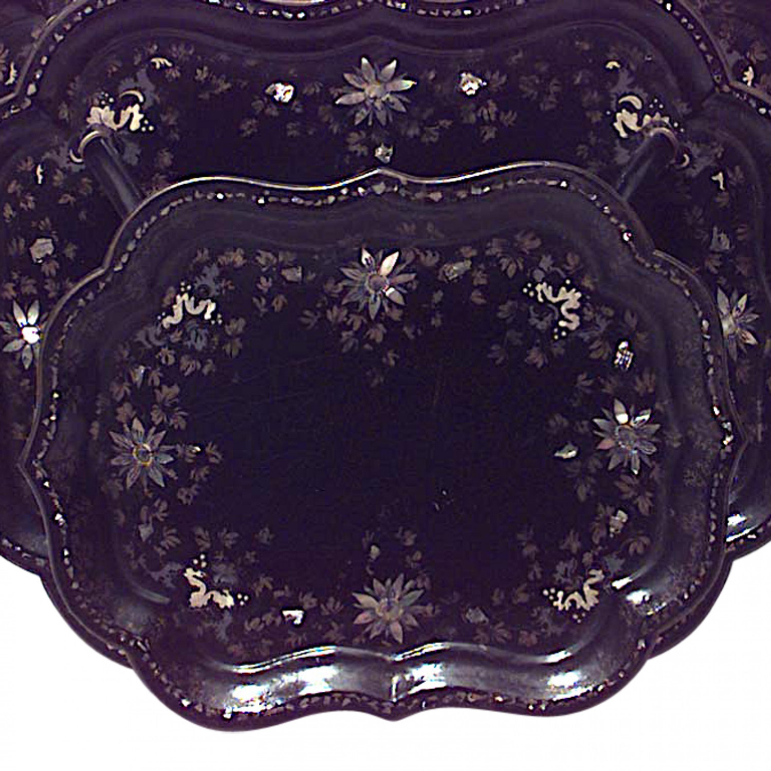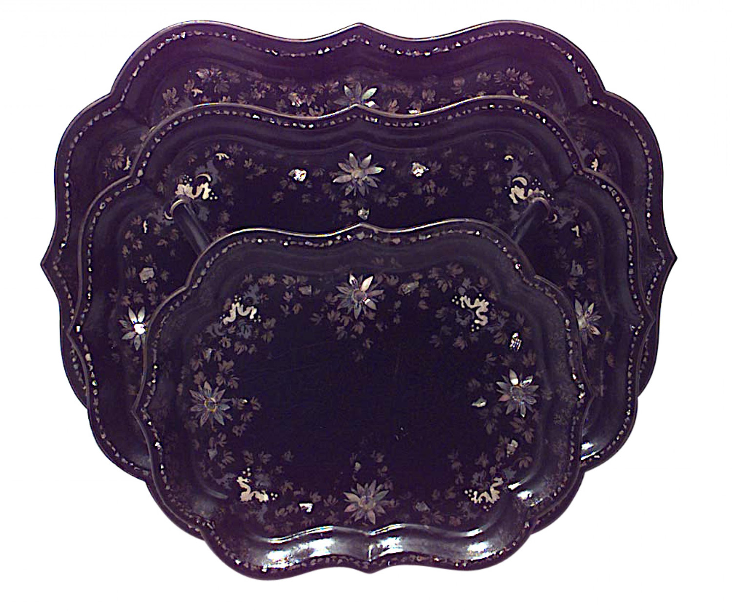 English Victorian papier mache pearl inlaid and black lacquered shaped tray design 3 tier table with faux bamboo design.