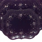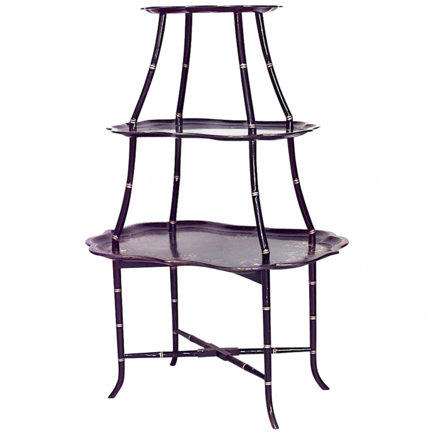 English Victorian papier mache pearl inlaid and black lacquered shaped tray design 3 tier table with faux bamboo design..