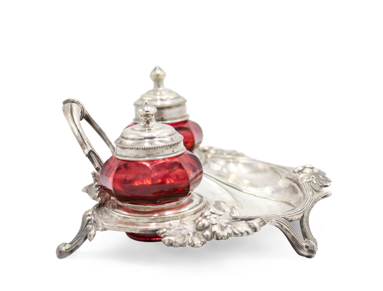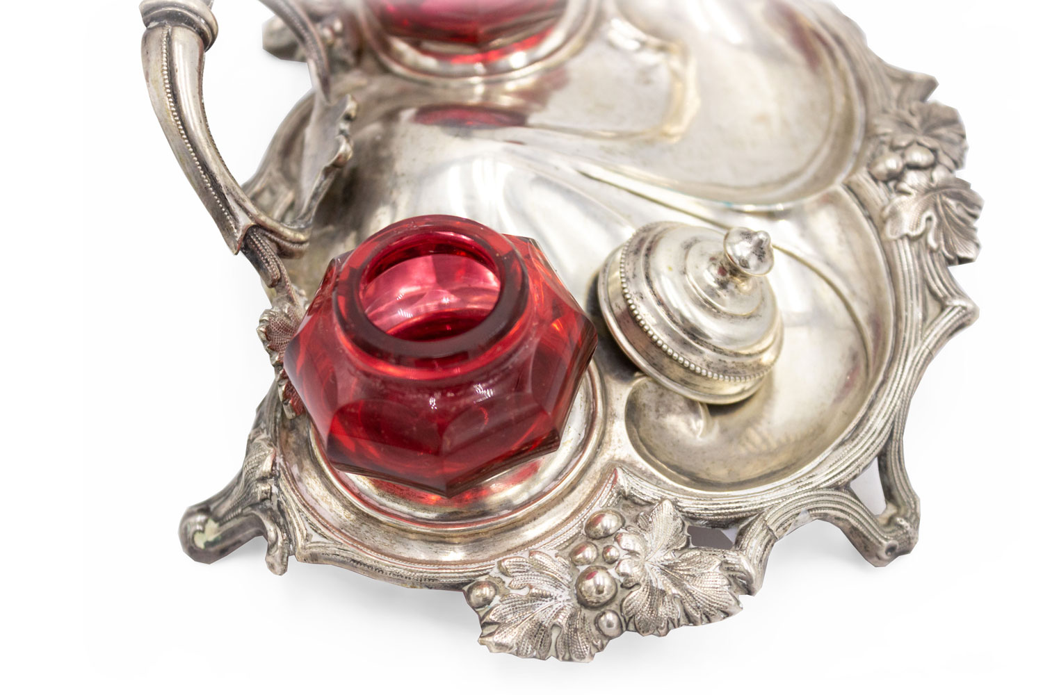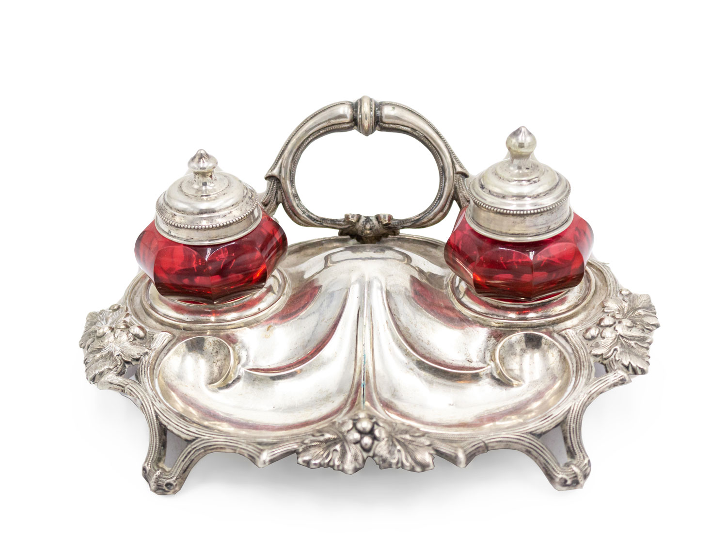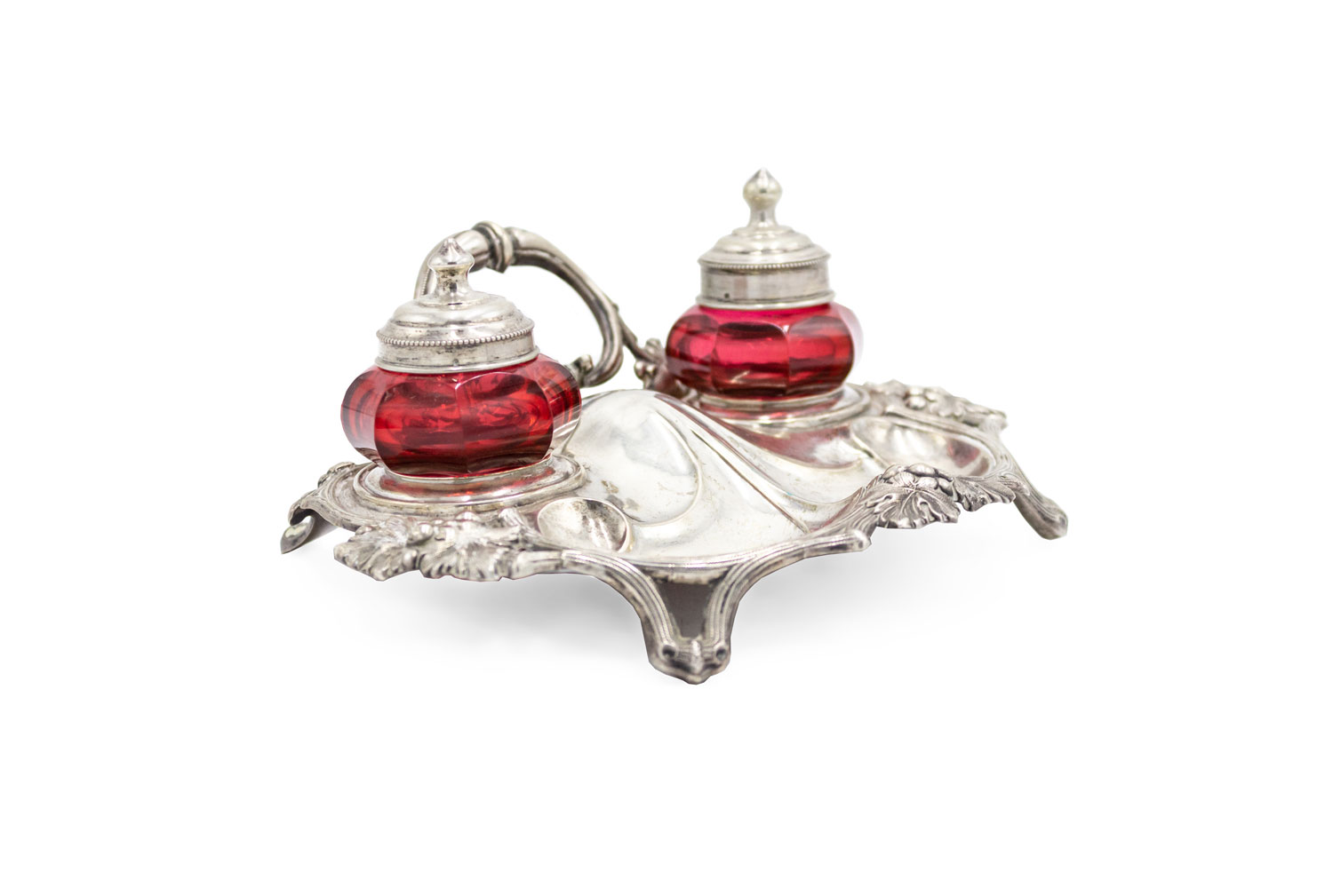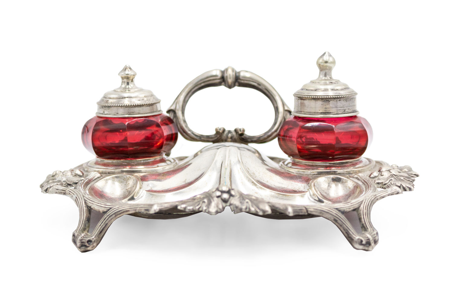 English Victorian silver plated inkwell with 2 cranberry glass wells and back handle.
