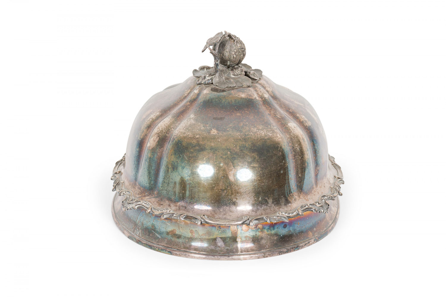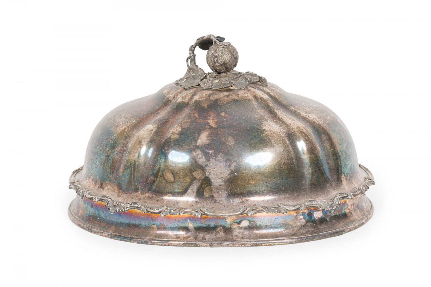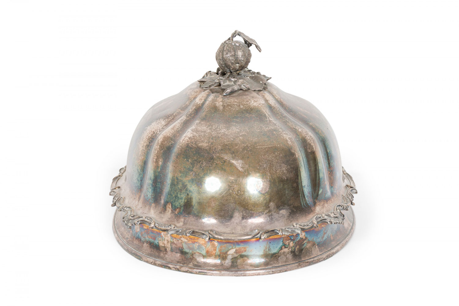 English Victorian silver plate dome shaped tray cover with melon finial and scalloped edge. (Signed: "A.B.SAVORY & SONS, London. Best Sheffield Plate Heavysilver Plating 80dwts. 8 lbs.").