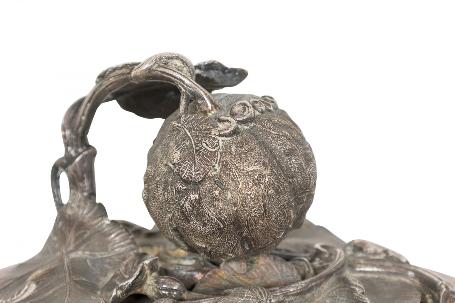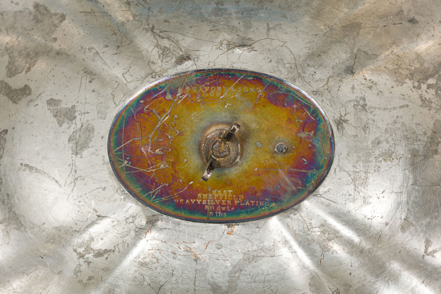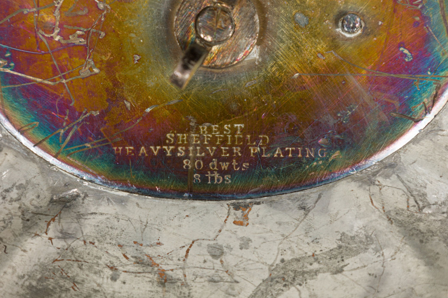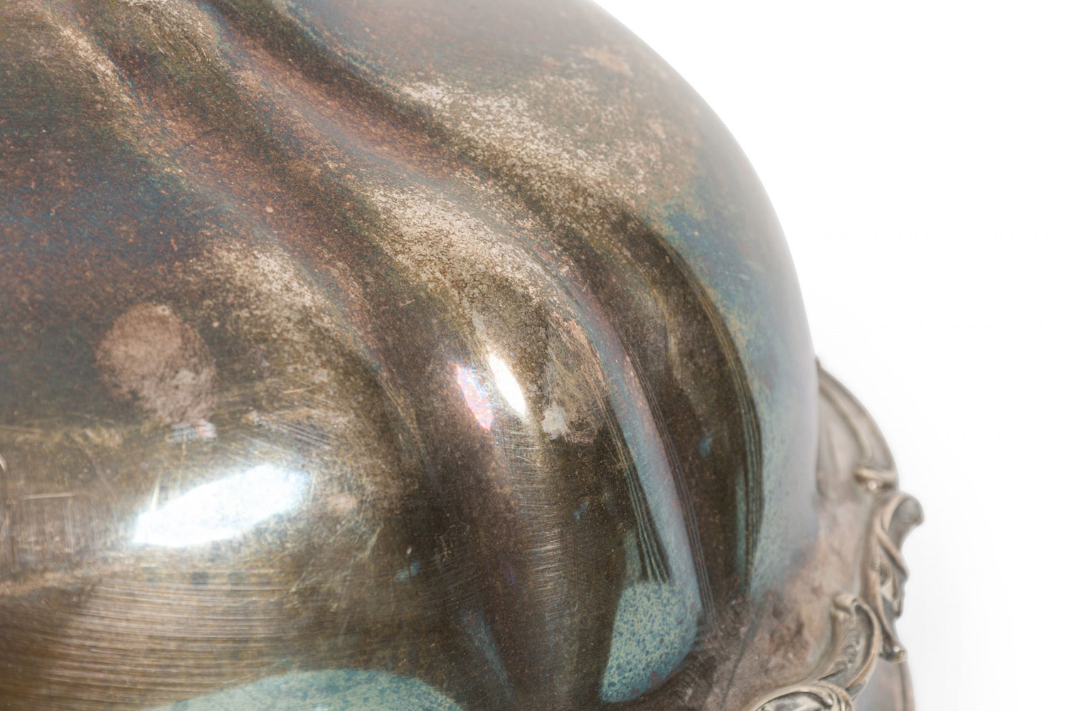 English Victorian silver plate dome shaped tray cover with melon finial and scalloped edge. (Signed: "A.B.SAVORY & SONS, London. Best Sheffield Plate Heavysilver Plating 80dwts. 8 lbs.").