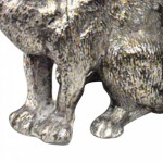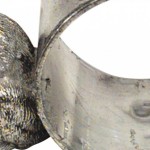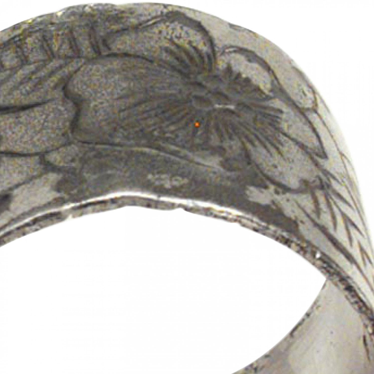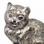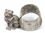 English Victorian silver plate napkin ring with etched floral design and seated cat figure.