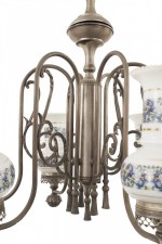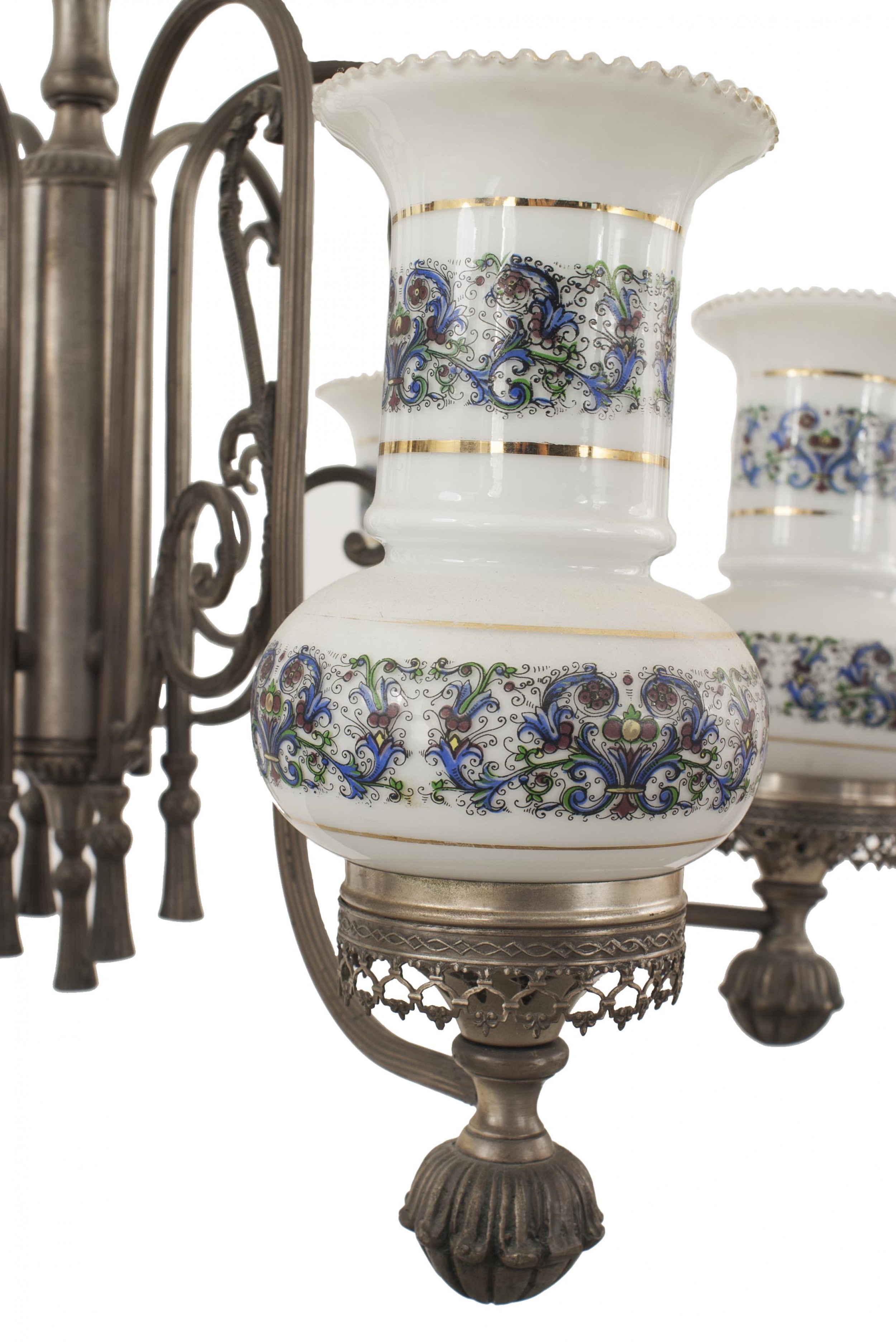 English Victorian style patinated pewter 6-arm chandelier with white glass hurricane globes featuring a blue, green, and red floral pattern.