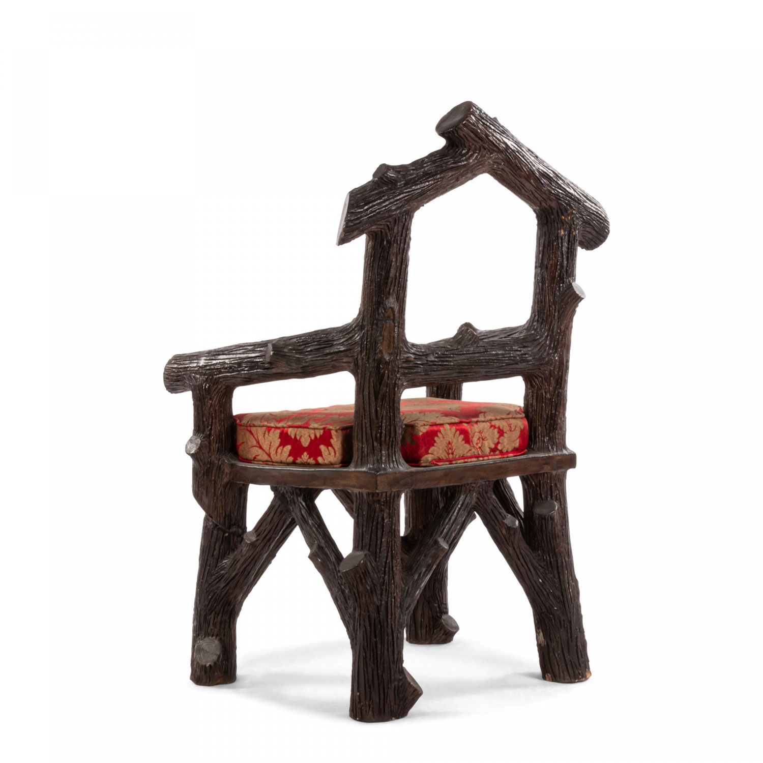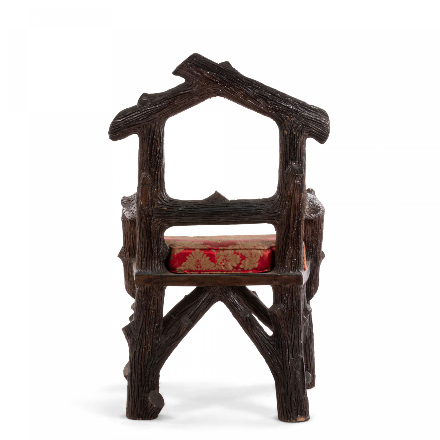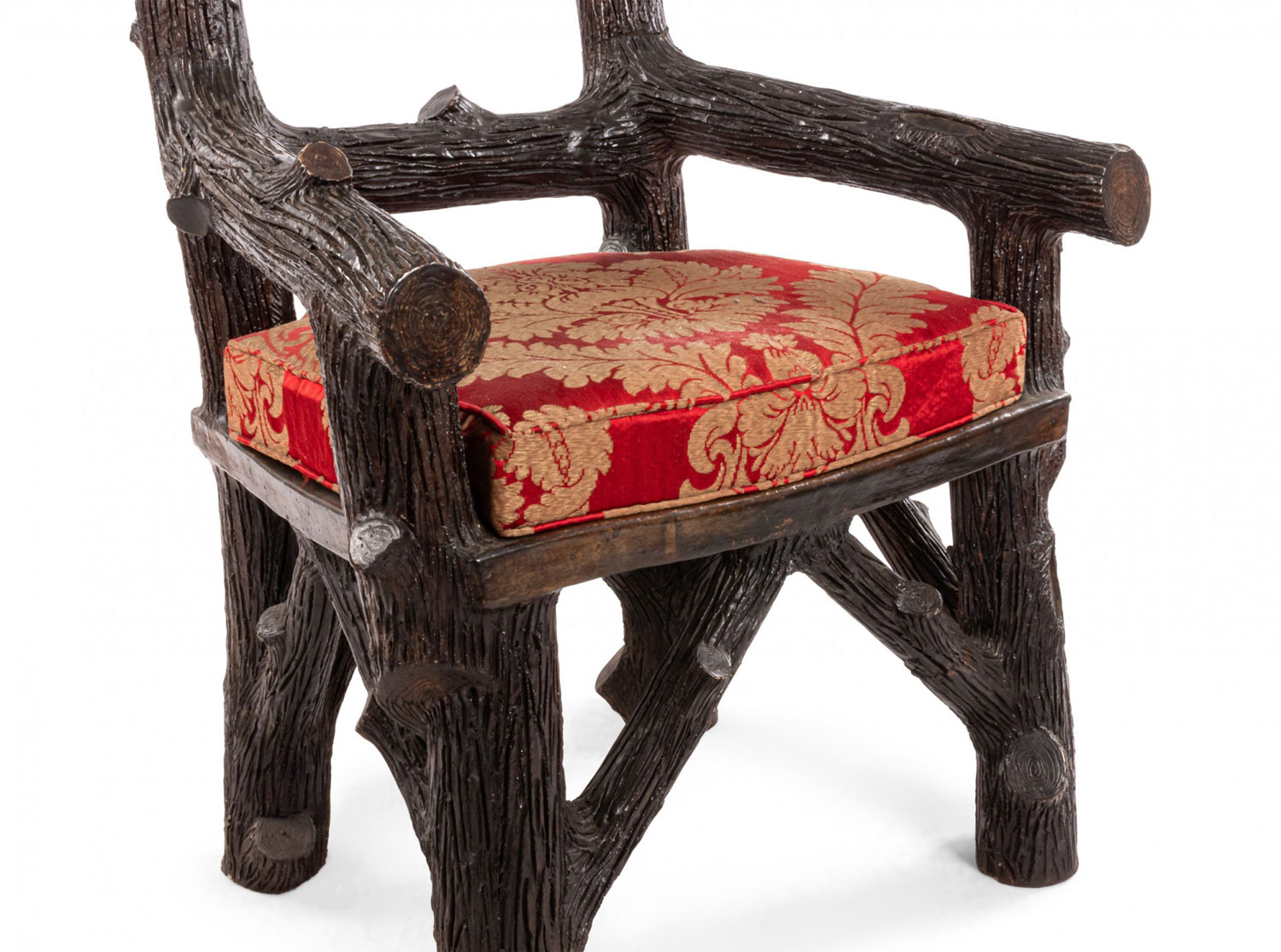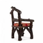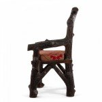 English Victorian Rustic style glazed brown terra cotta arm chair with faux twig design with open pediment shaped back..