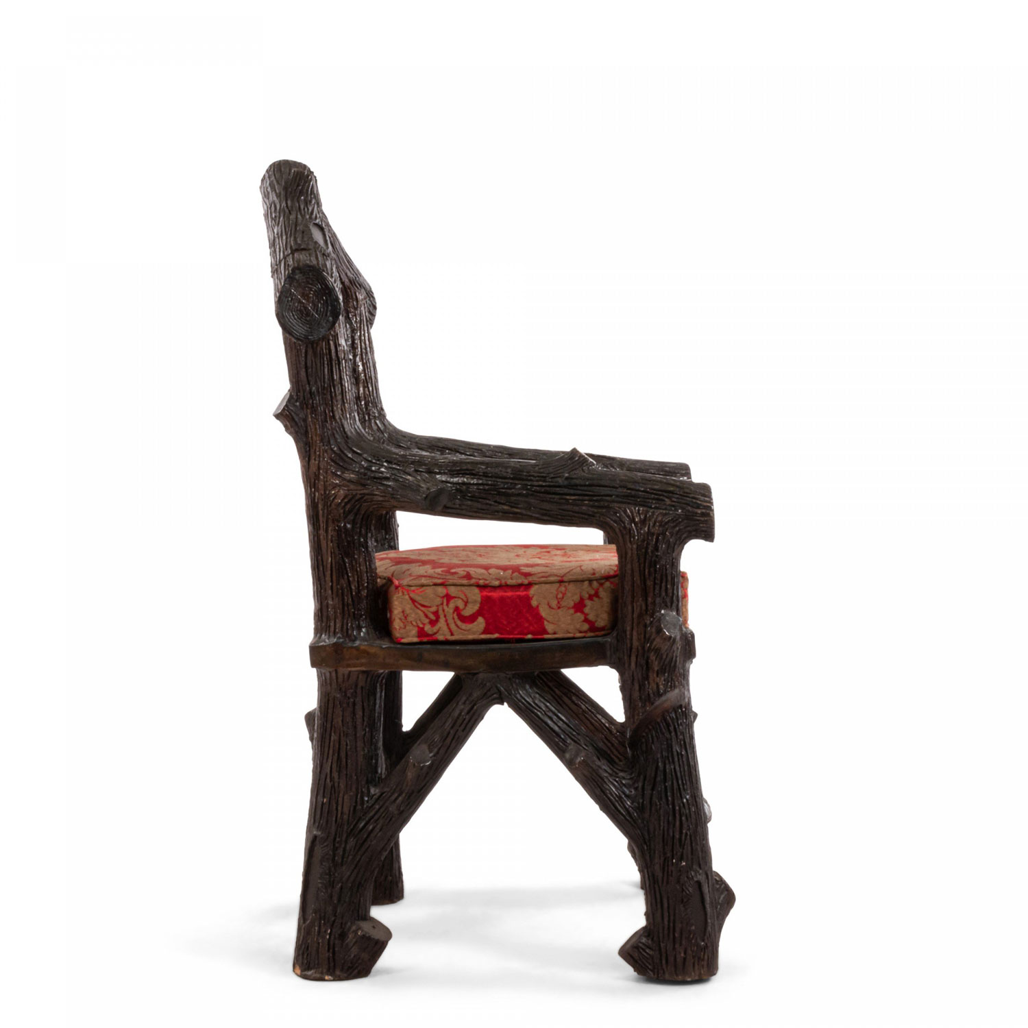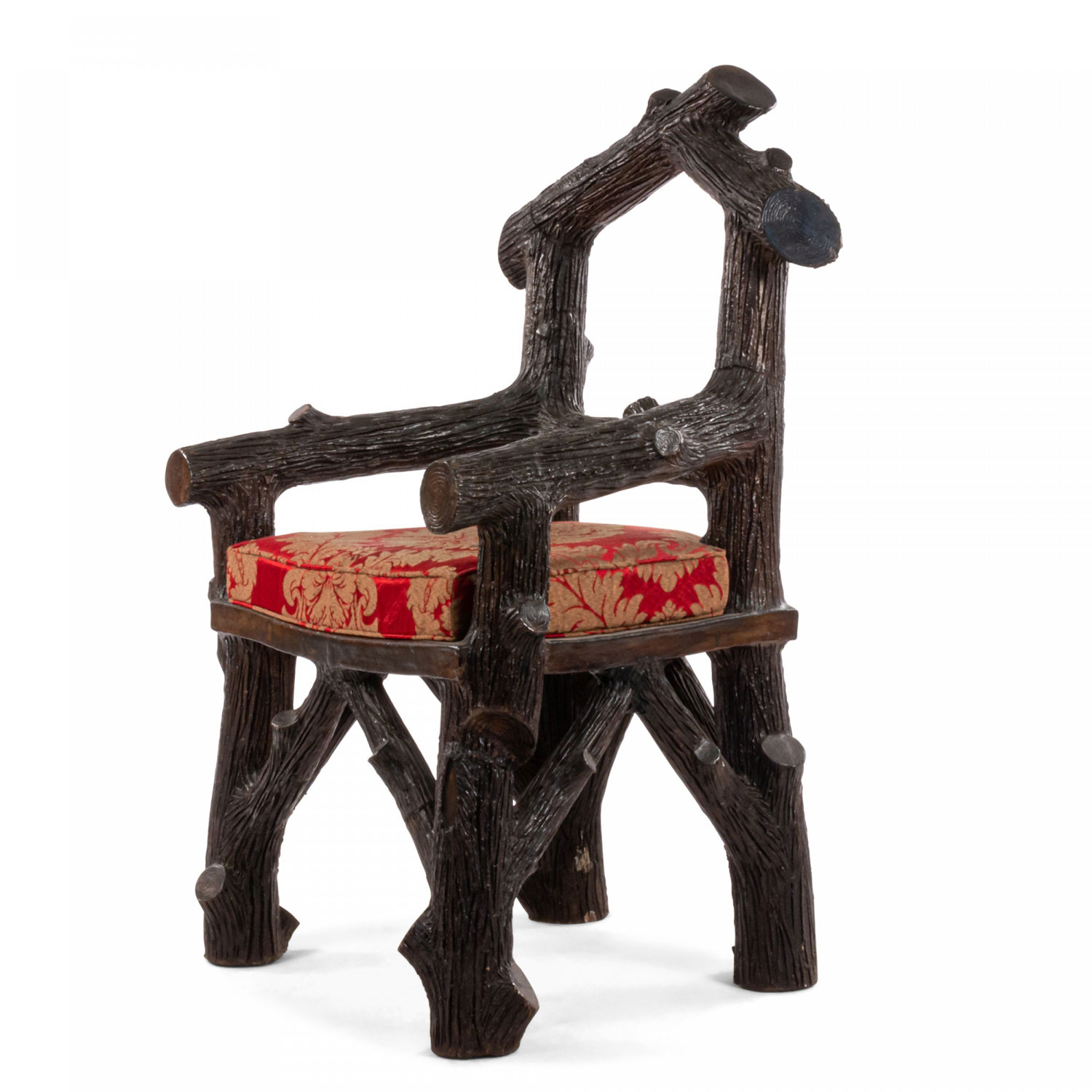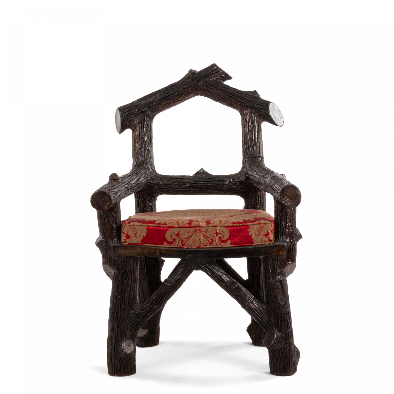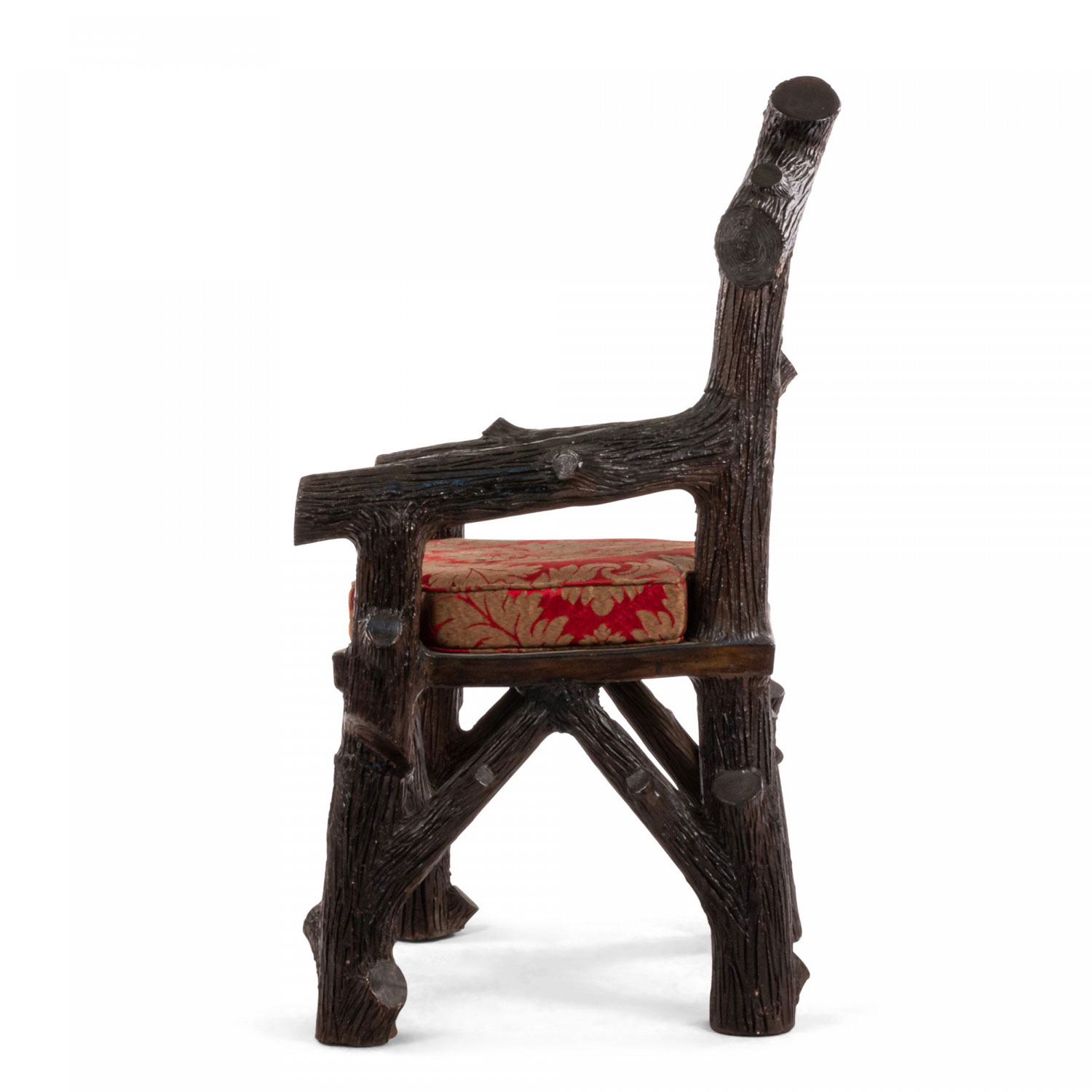 English Victorian Rustic style glazed brown terra cotta arm chair with faux twig design with open pediment shaped back..