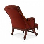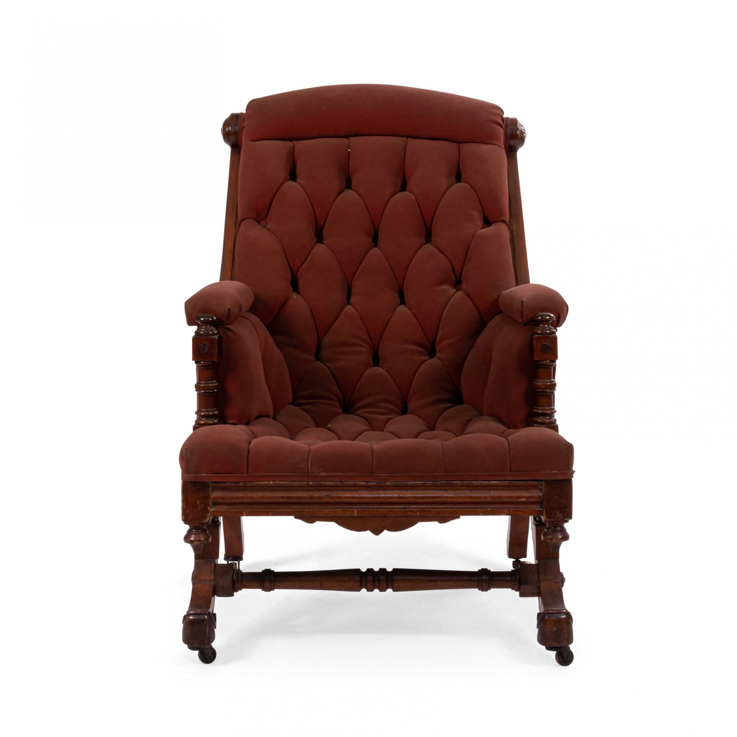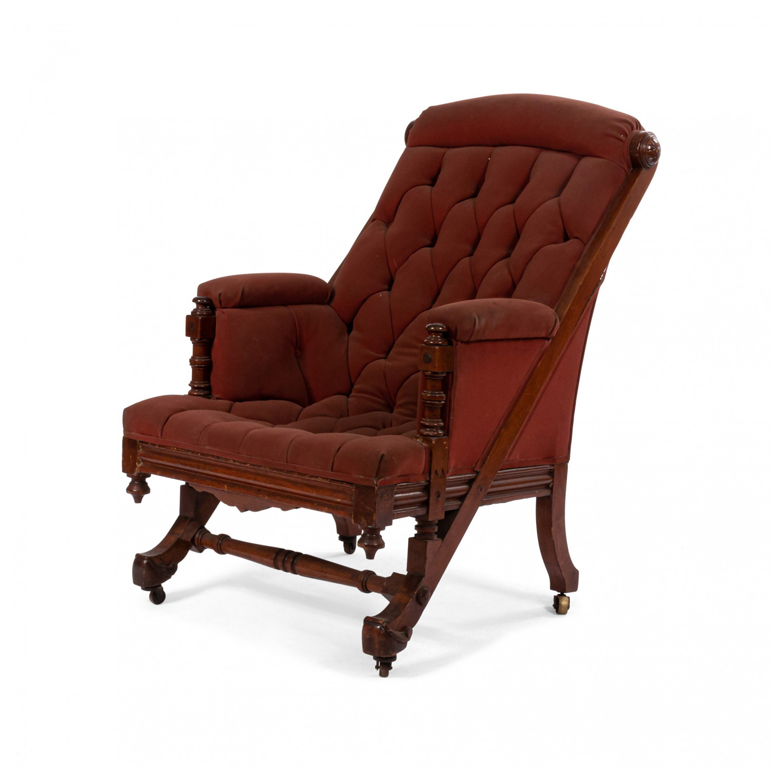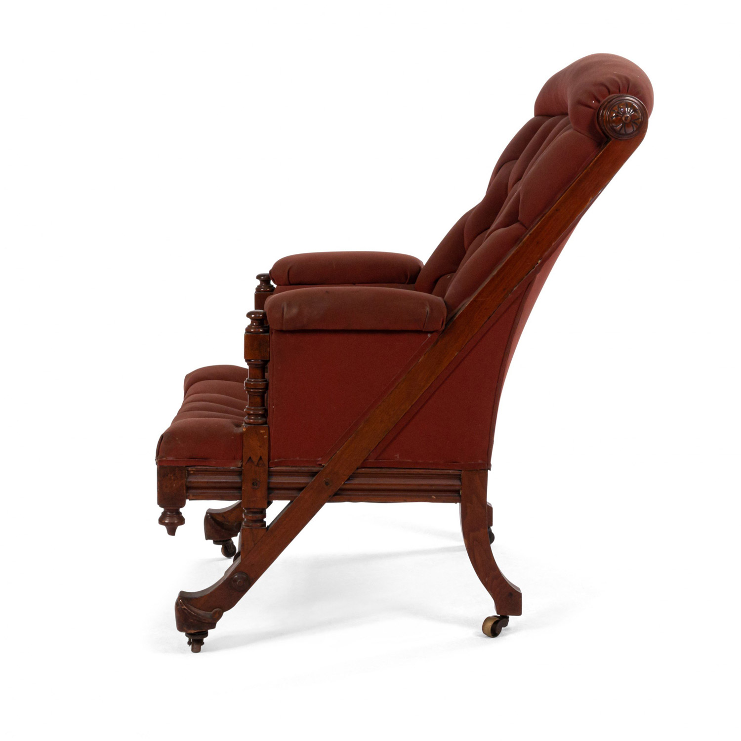 English Victorian walnut slant back arm chair with tufted rust upholstery.