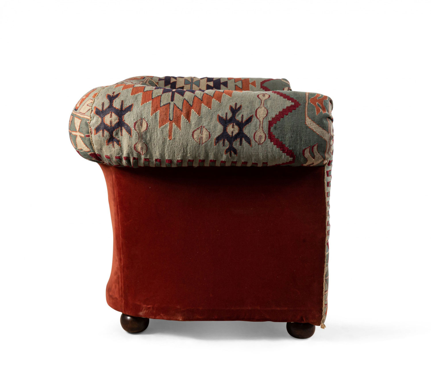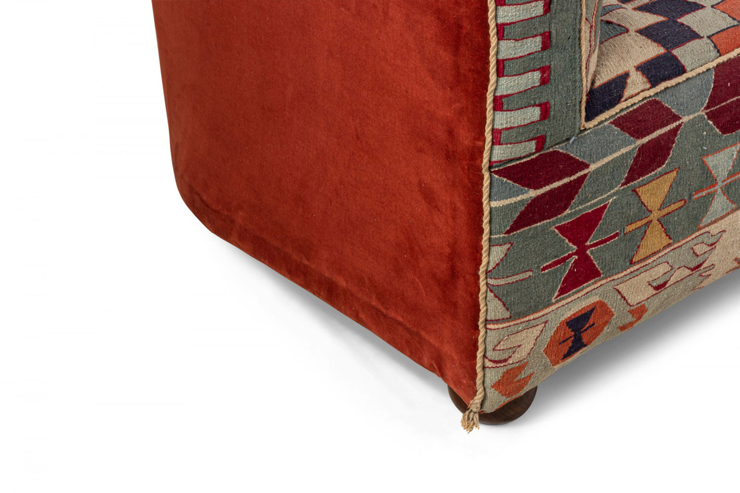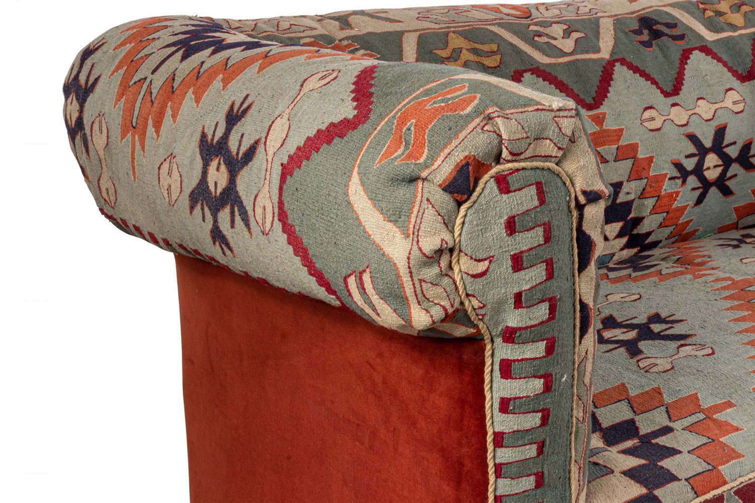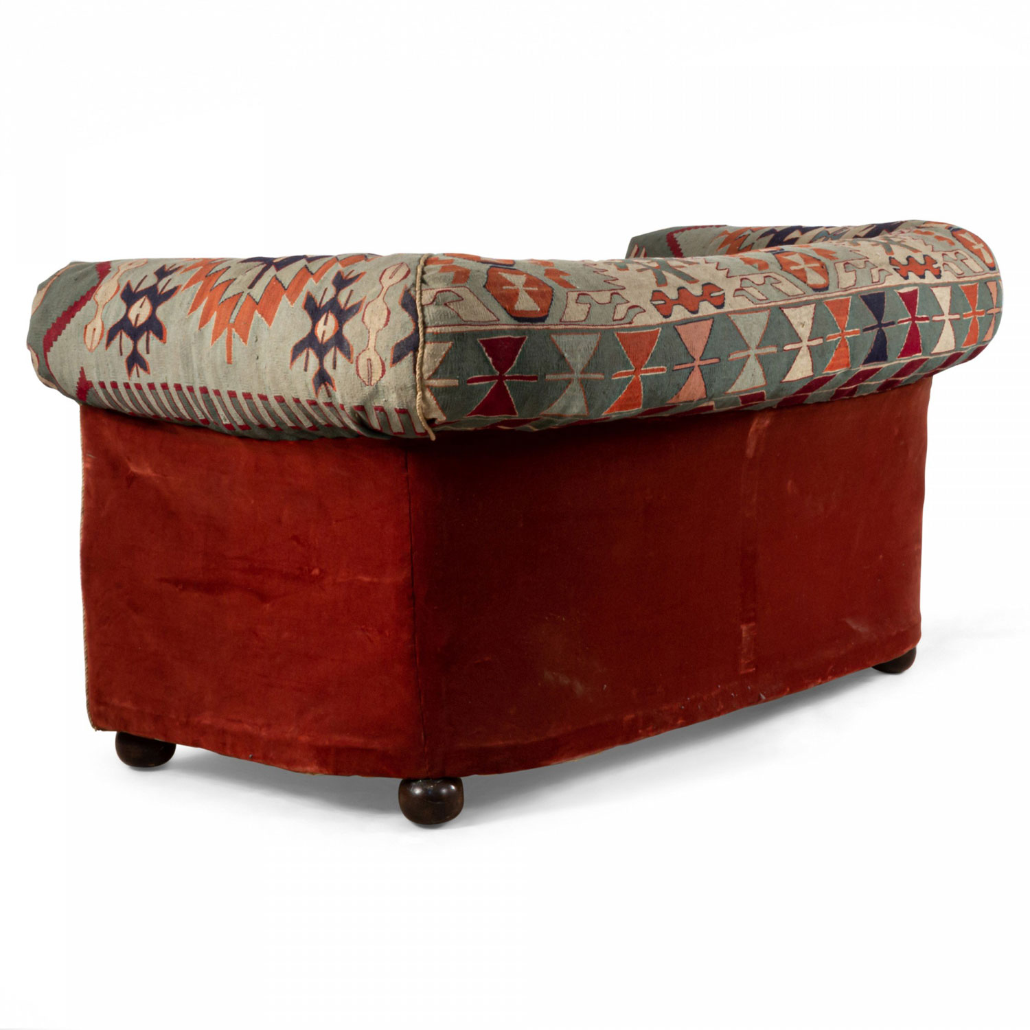 English Victorian style (20th Cent) roll arm and back loveseats with Turkish kilim upholstery