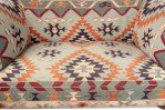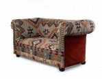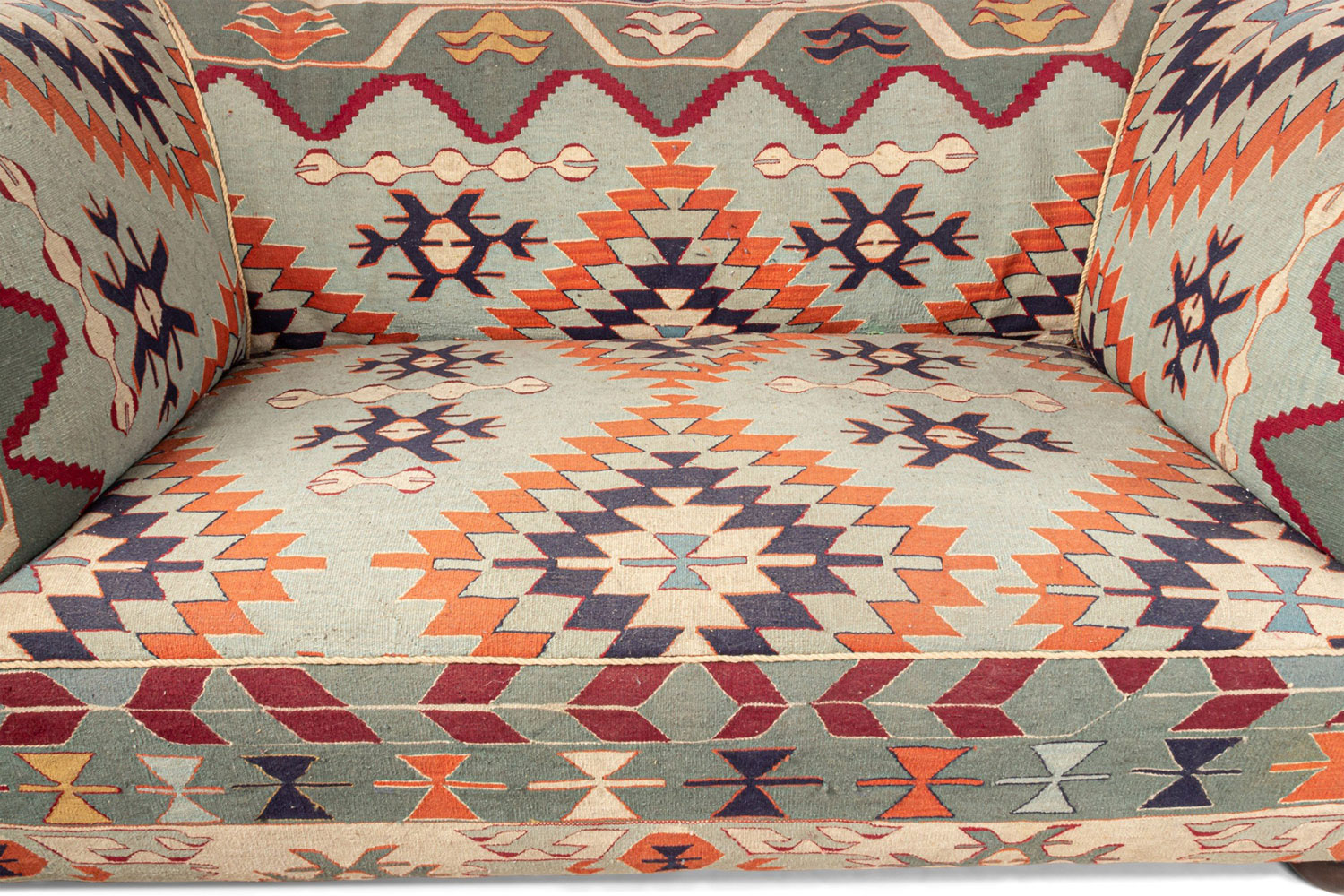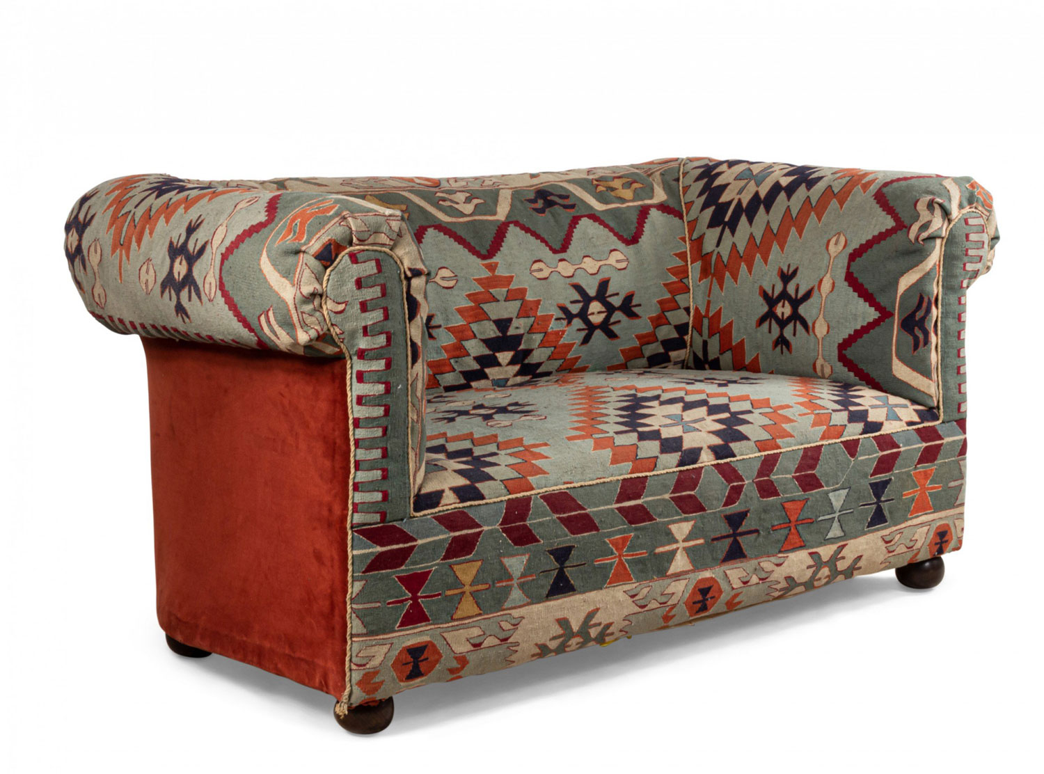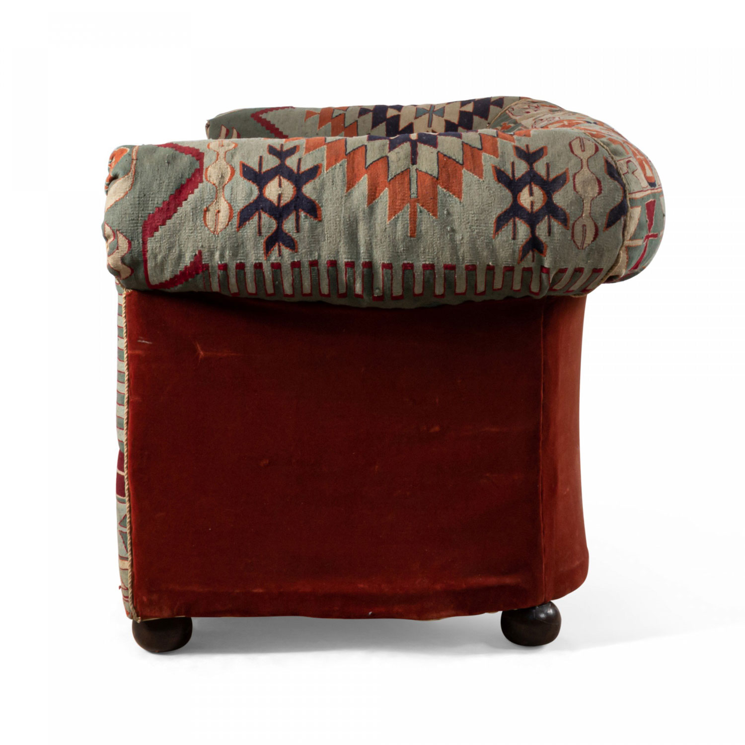 English Victorian style (20th Cent) roll arm and back loveseats with Turkish kilim upholstery