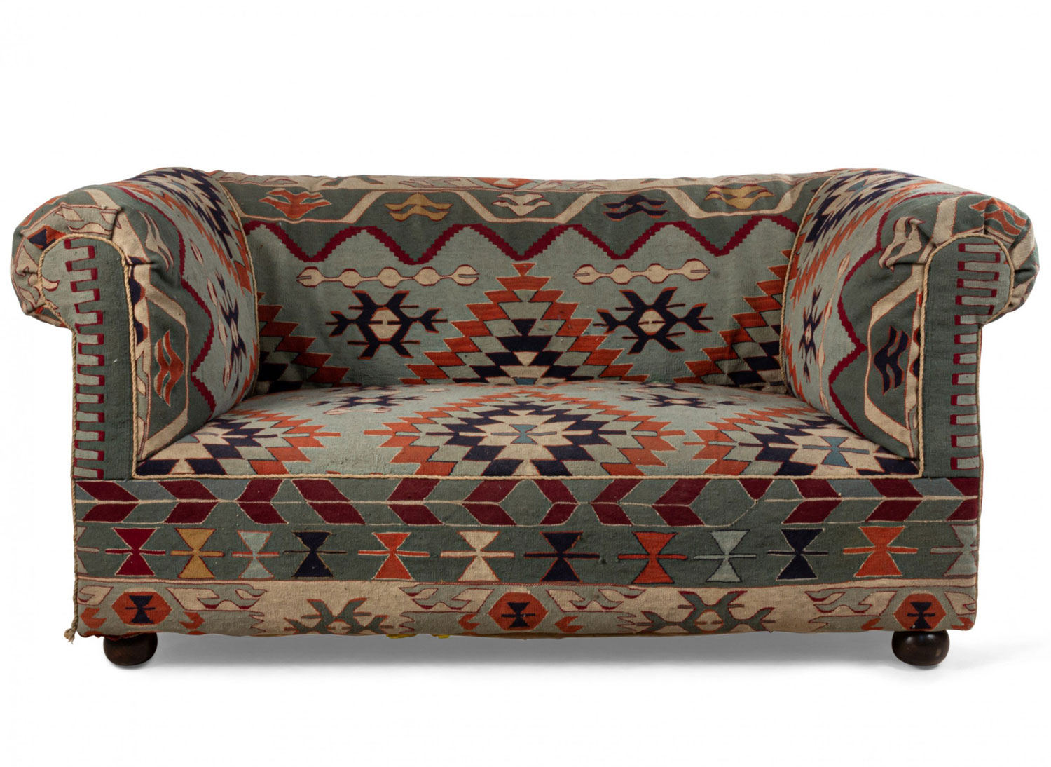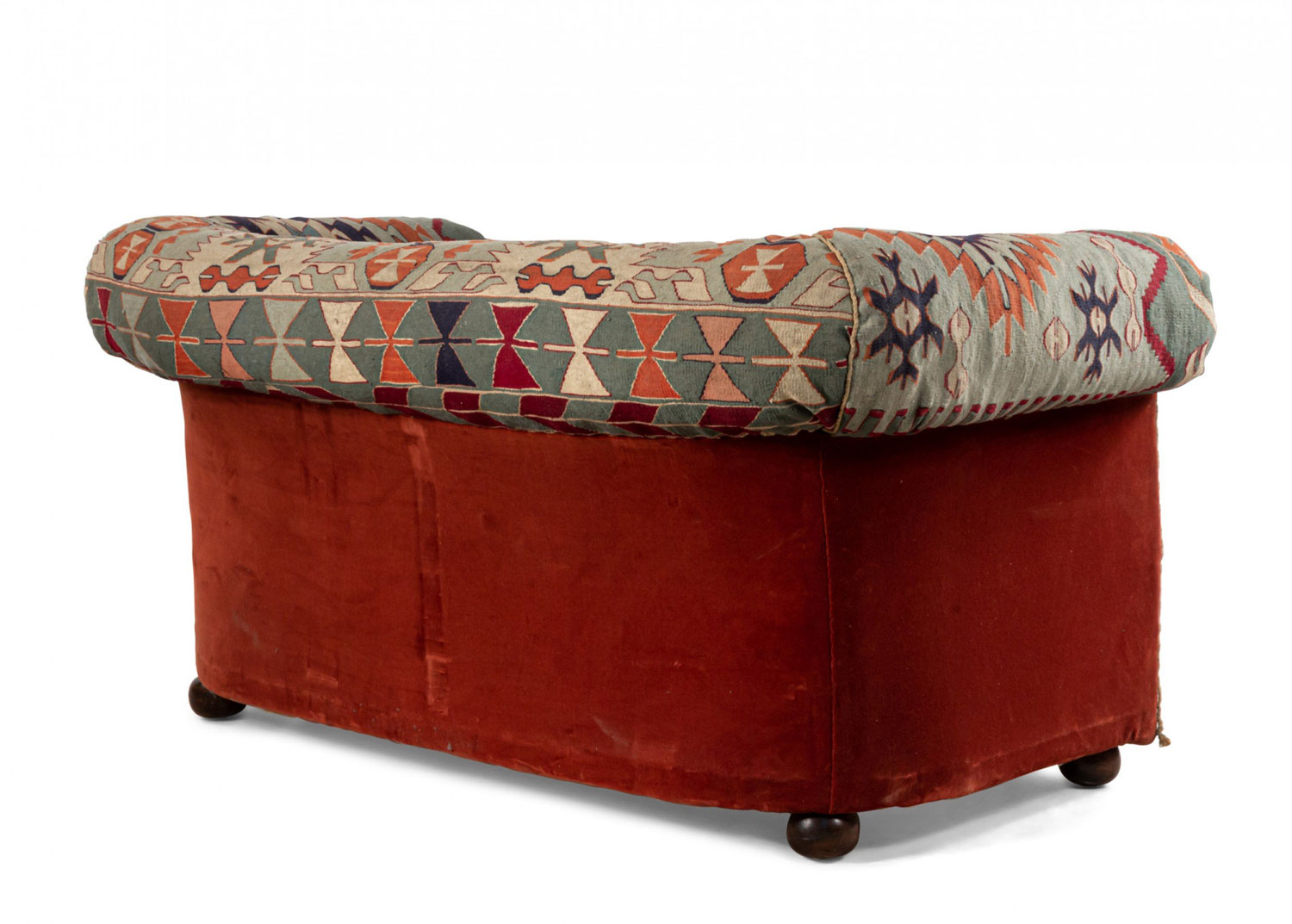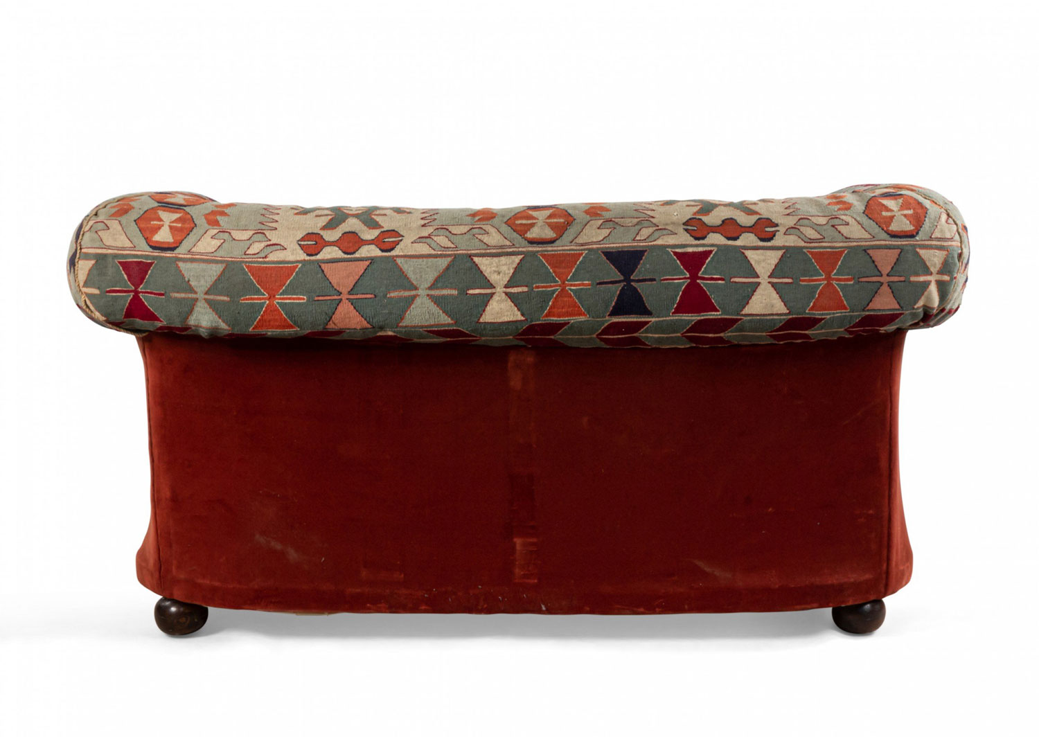 English Victorian style (20th Cent) roll arm and back loveseats with Turkish kilim upholstery.