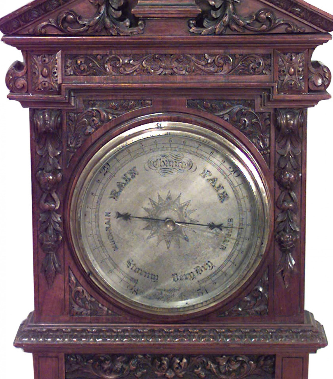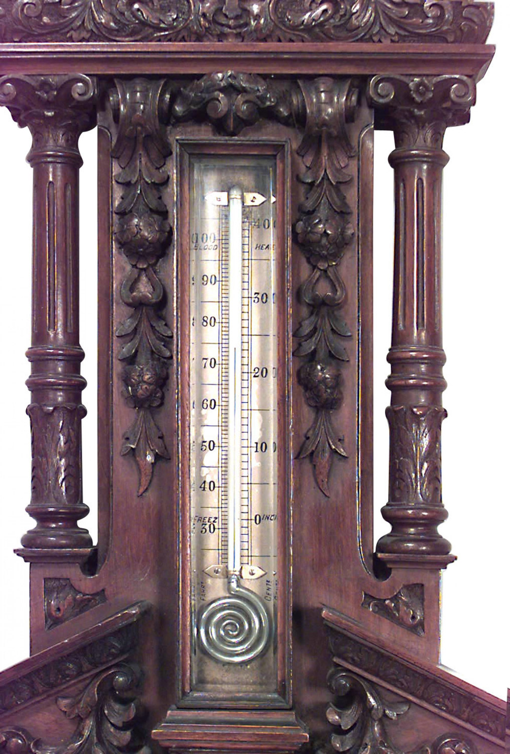 English Victorian walnut carved wall barometer and thermometer centered between fluted columns with double broken pediment design and an urn finial top..