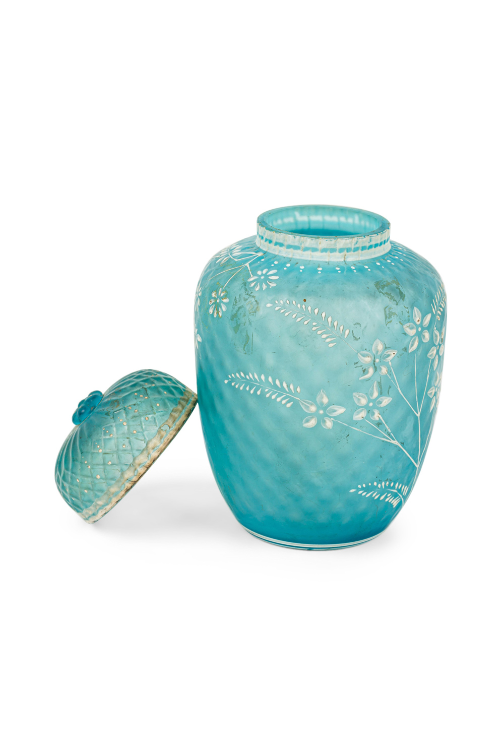 English Victorian (Webb) style blue glass vase with cover and white cameo floral decoration..