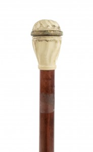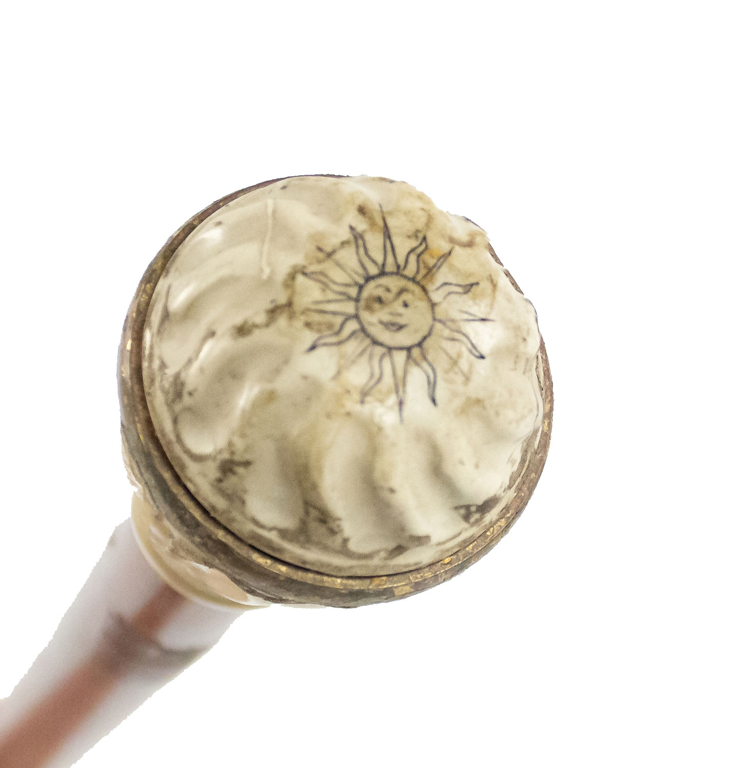 English Victorian style dark wood cane with swirl top that opens to reveal a sundial and compass interior with a brass bottom tip