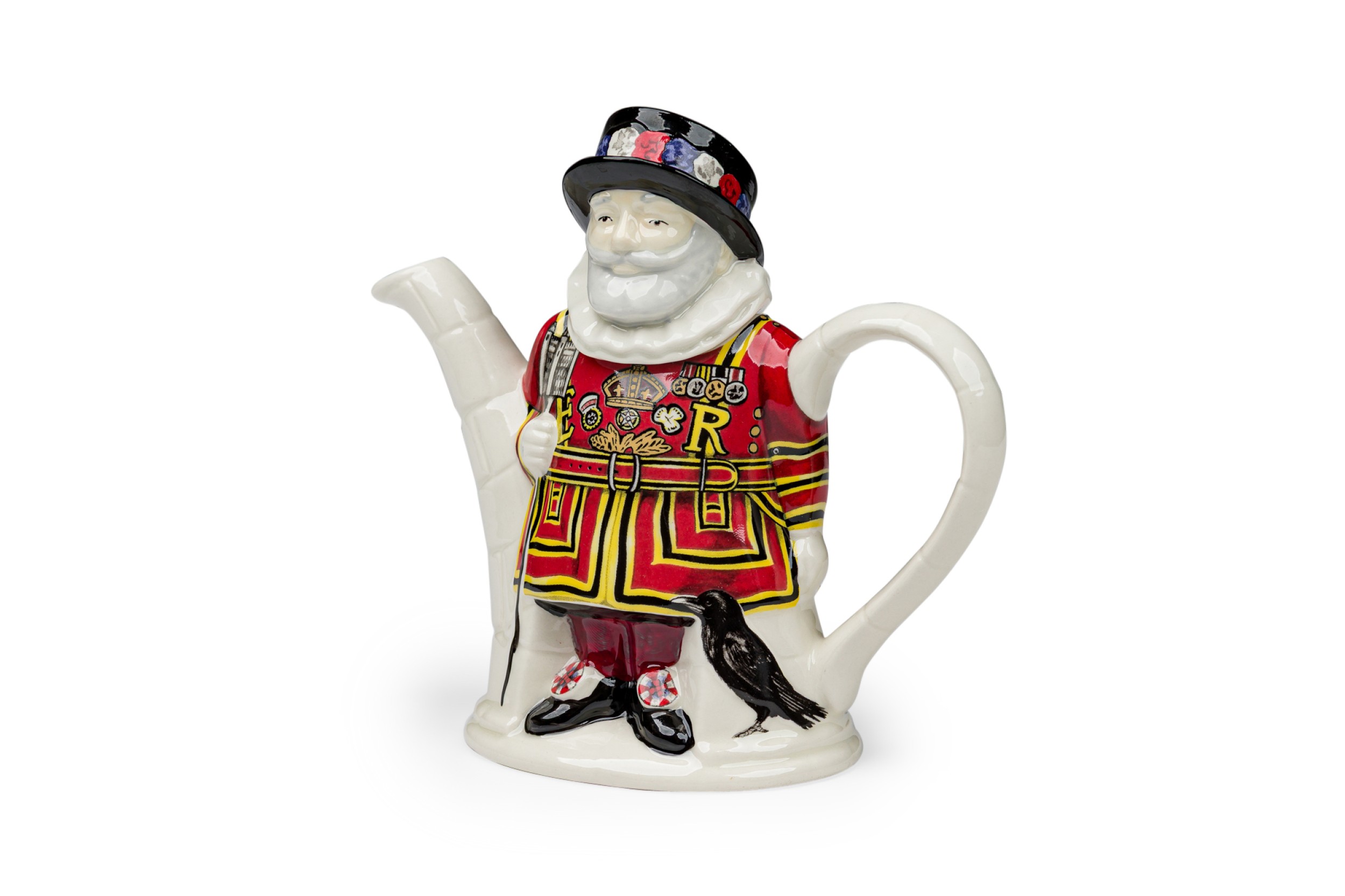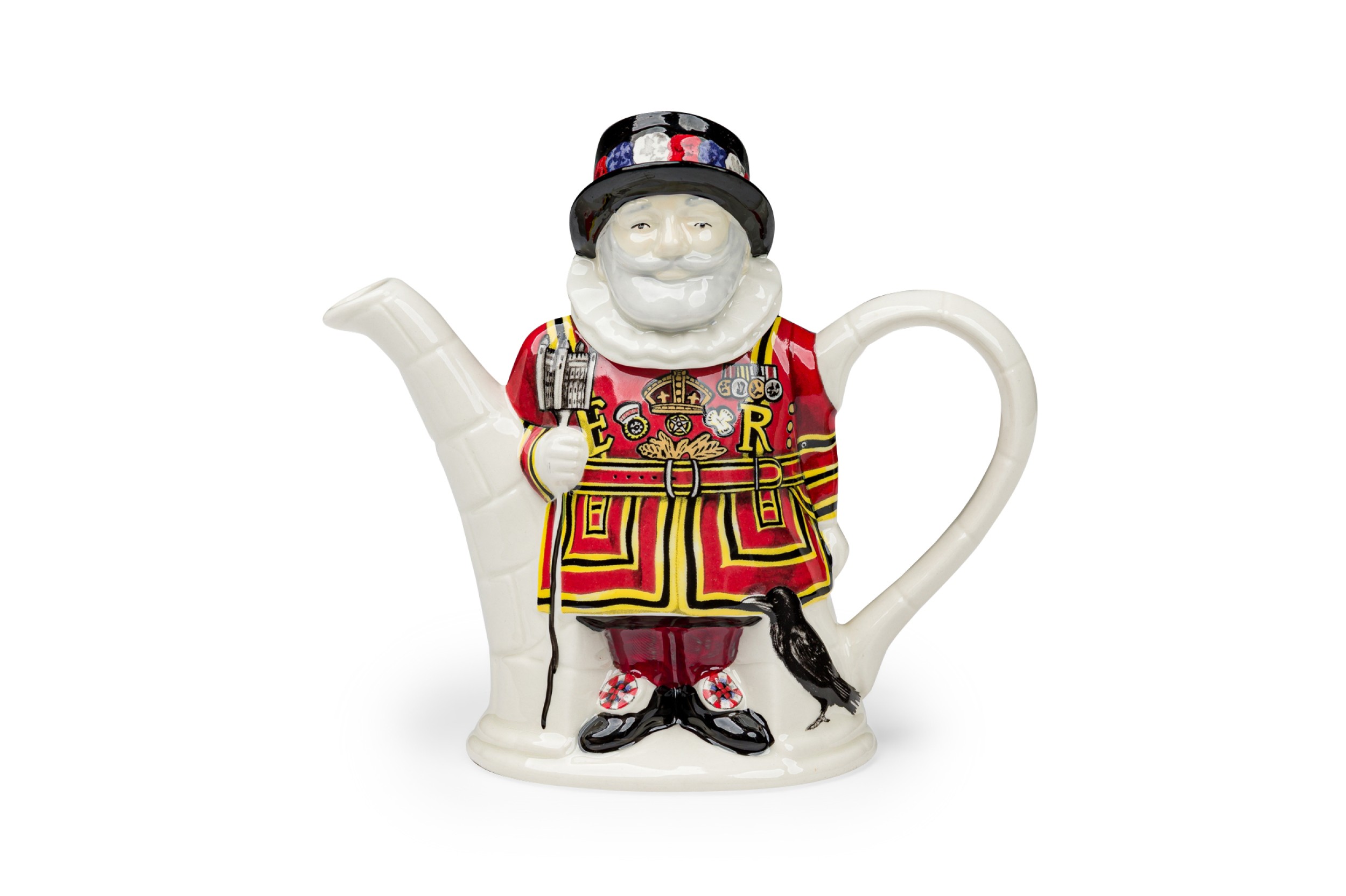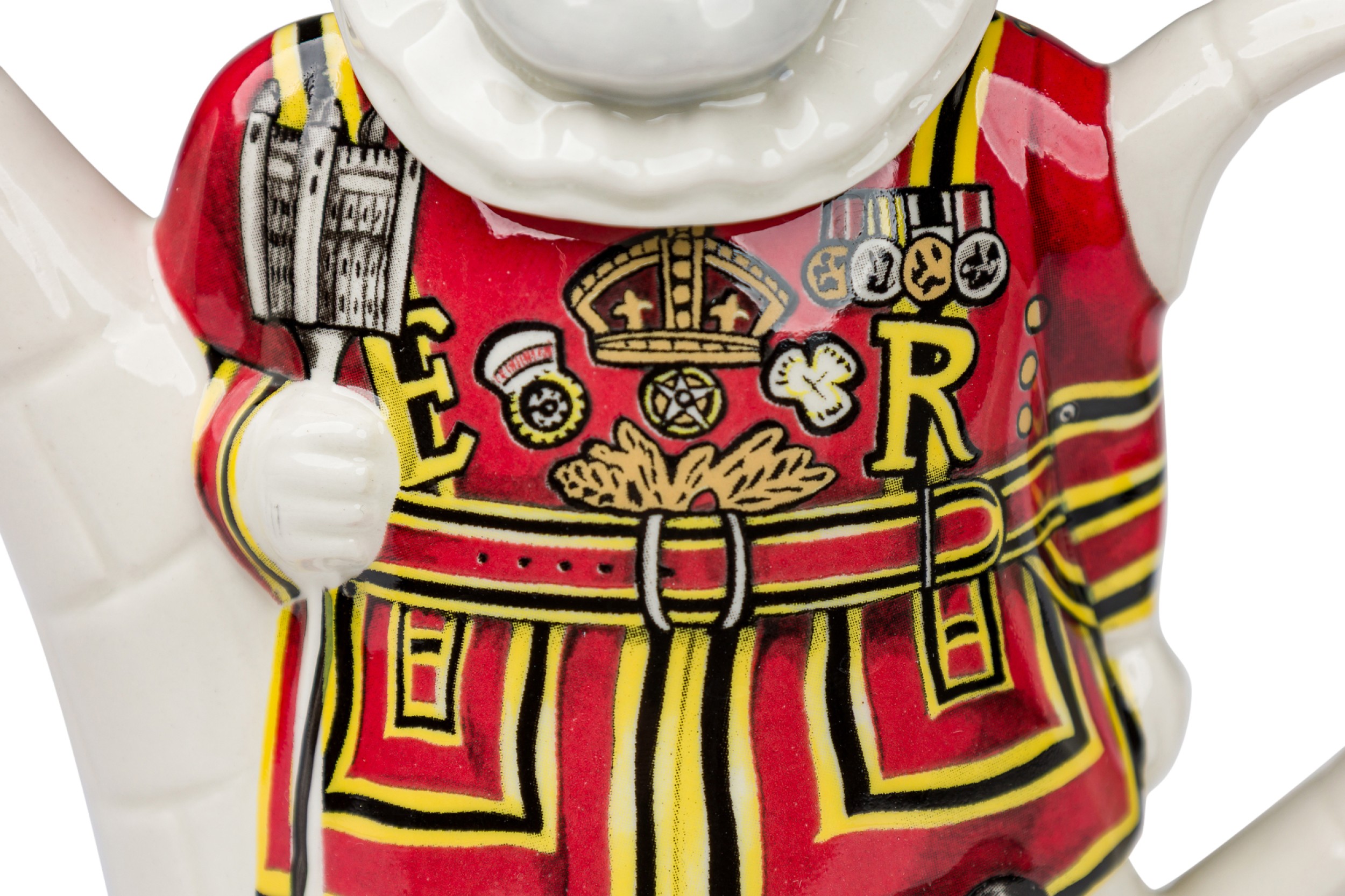 English Vintage teapot with a yeoman dressed in traditional red and yellow trimmed cloths y on a circular base (James Sadler Yeoman Warder Thameside).