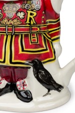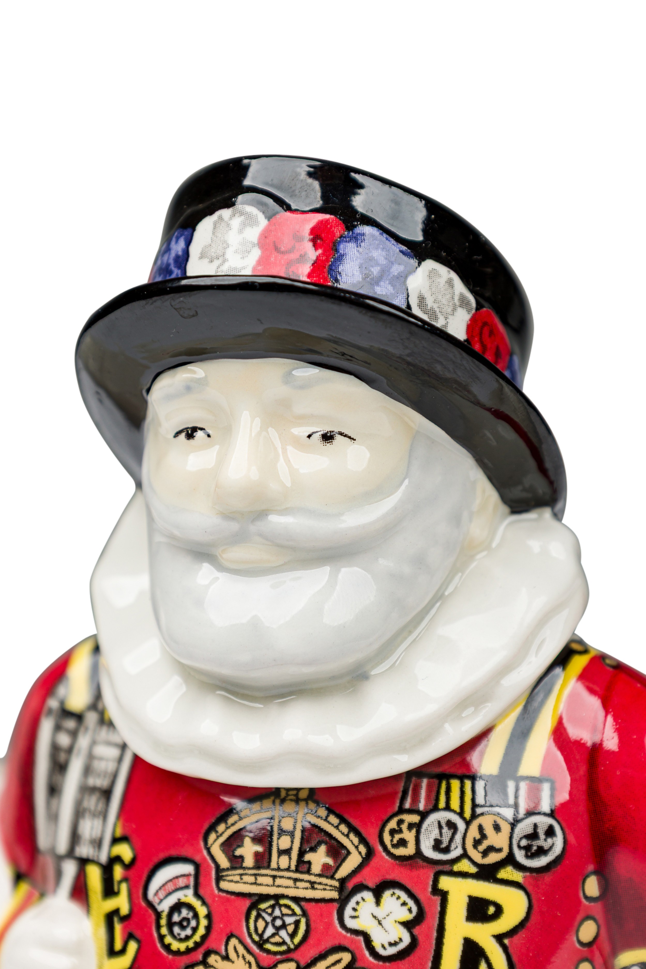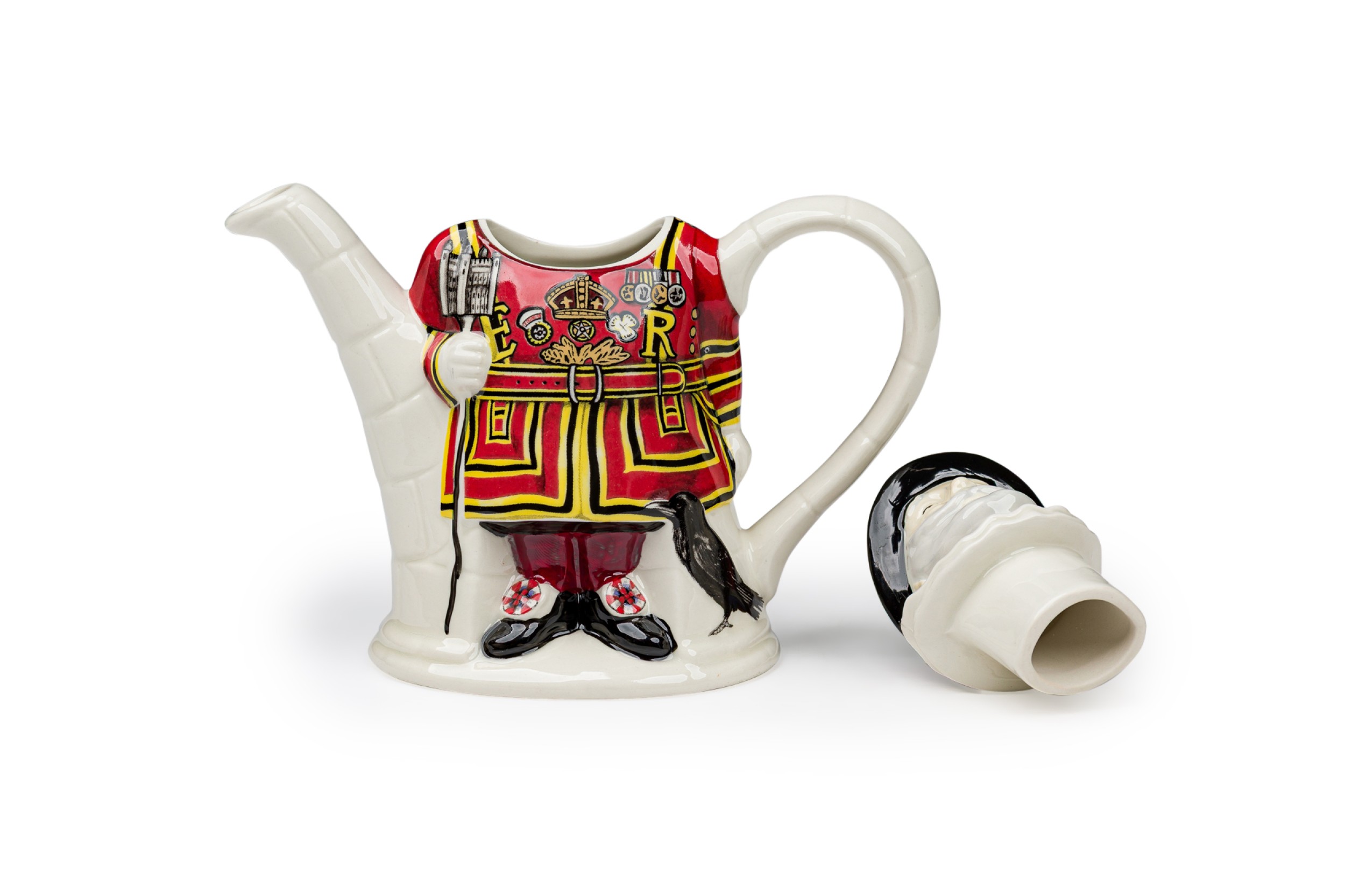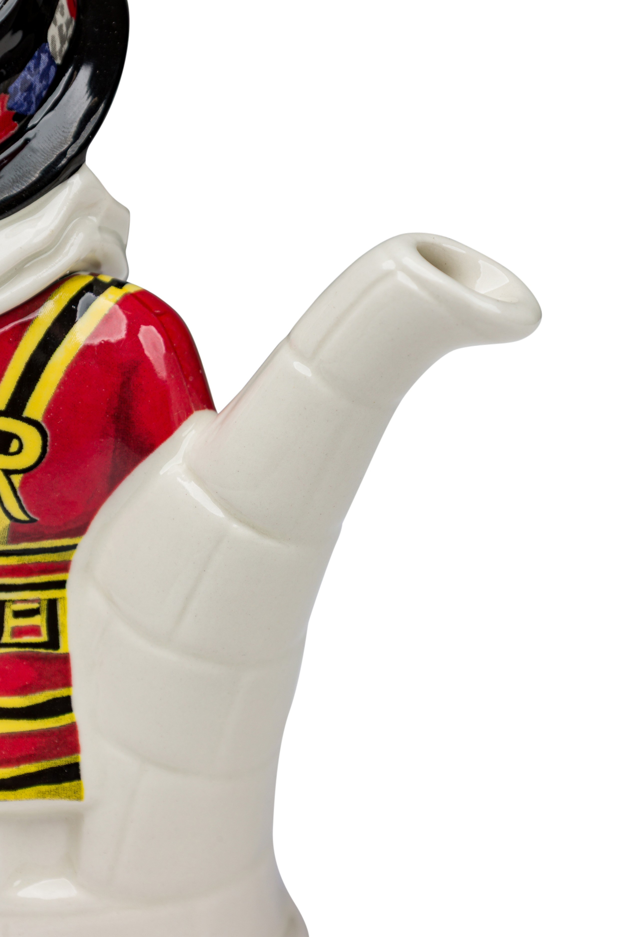 English Vintage teapot with a yeoman dressed in traditional red and yellow trimmed cloths y on a circular base (James Sadler Yeoman Warder Thameside).